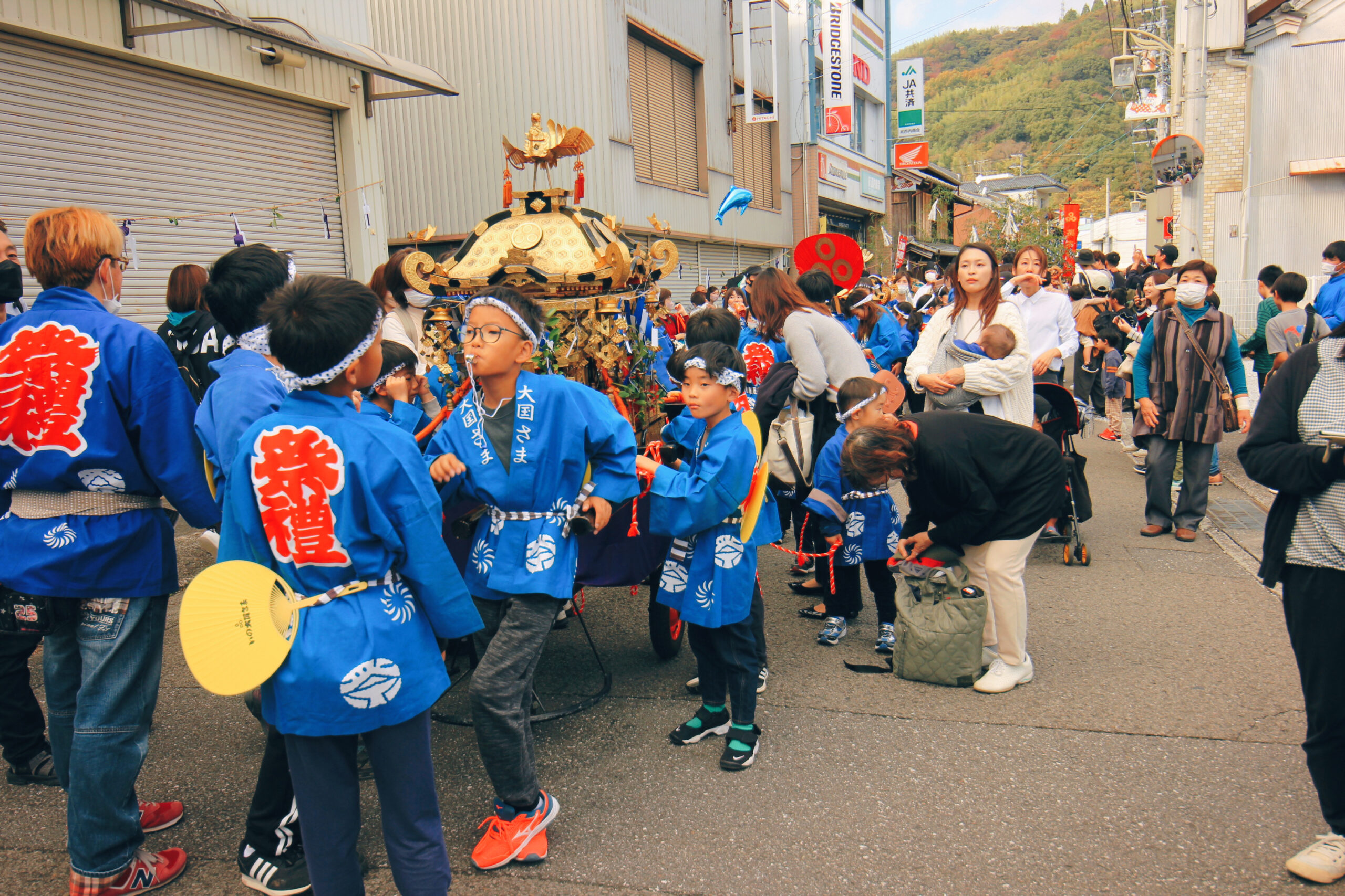 子どもたちの元気な声が秋晴れの空に響き渡ります。どうやら先頭は、子ども神輿のようです。