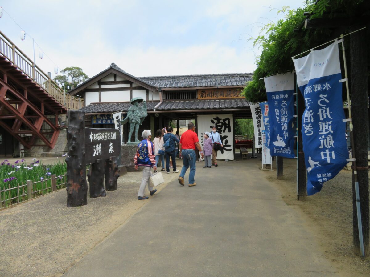 「水郷潮来あやめまつり」の開催期間中には、「水郷潮来あやめ園」の周囲を幟が取り囲みます。入口では浴衣姿の女性が笑顔で出迎えてくれます。入口広場には「潮来花嫁さん」の記念碑が設けられ、潮来市の伝統文化を伝えています。