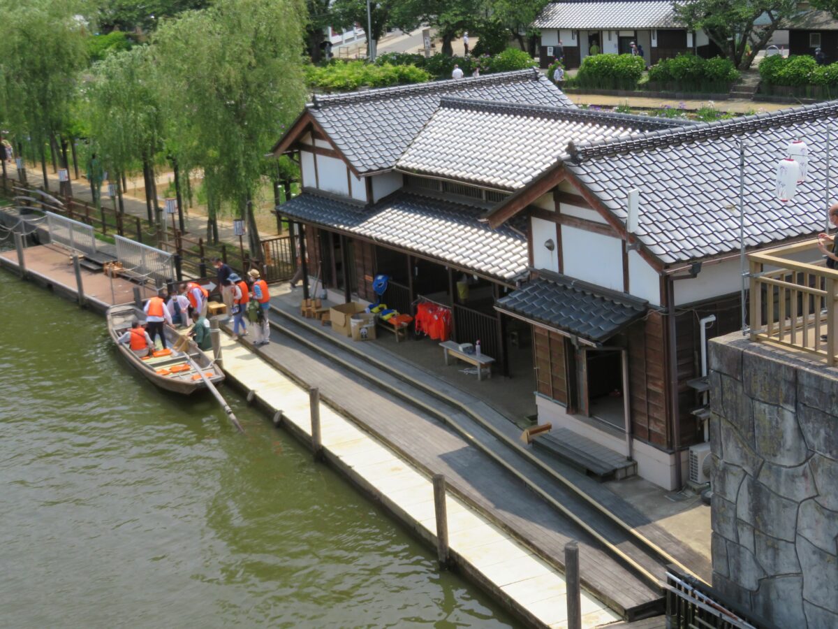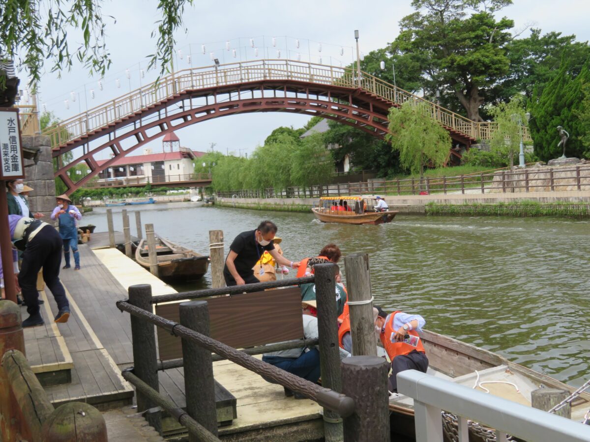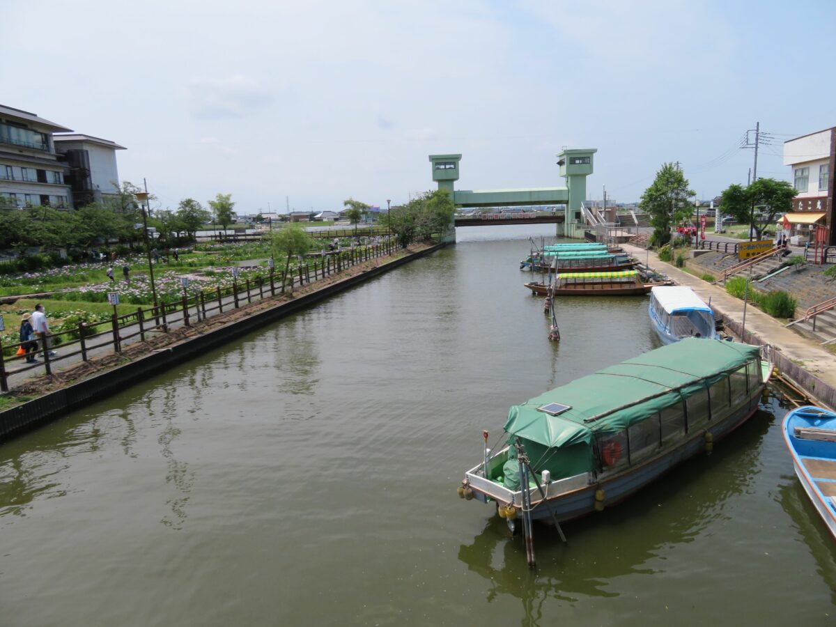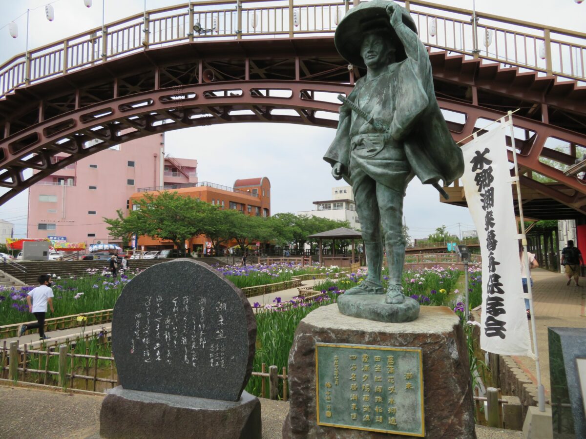 潮来笠の歌碑と潮来の伊太郎の像に接して、「ろ舟」の乗場が設けられています。2021年は「嫁入り舟」の運行は中止となりましたが、「ろ舟」の遊覧は例年通り行われています。手漕ぎの「ろ舟」に乗って前川を遊覧しながら、あやめの花を眺めれば豊かな風情を感じることができるでしょう。