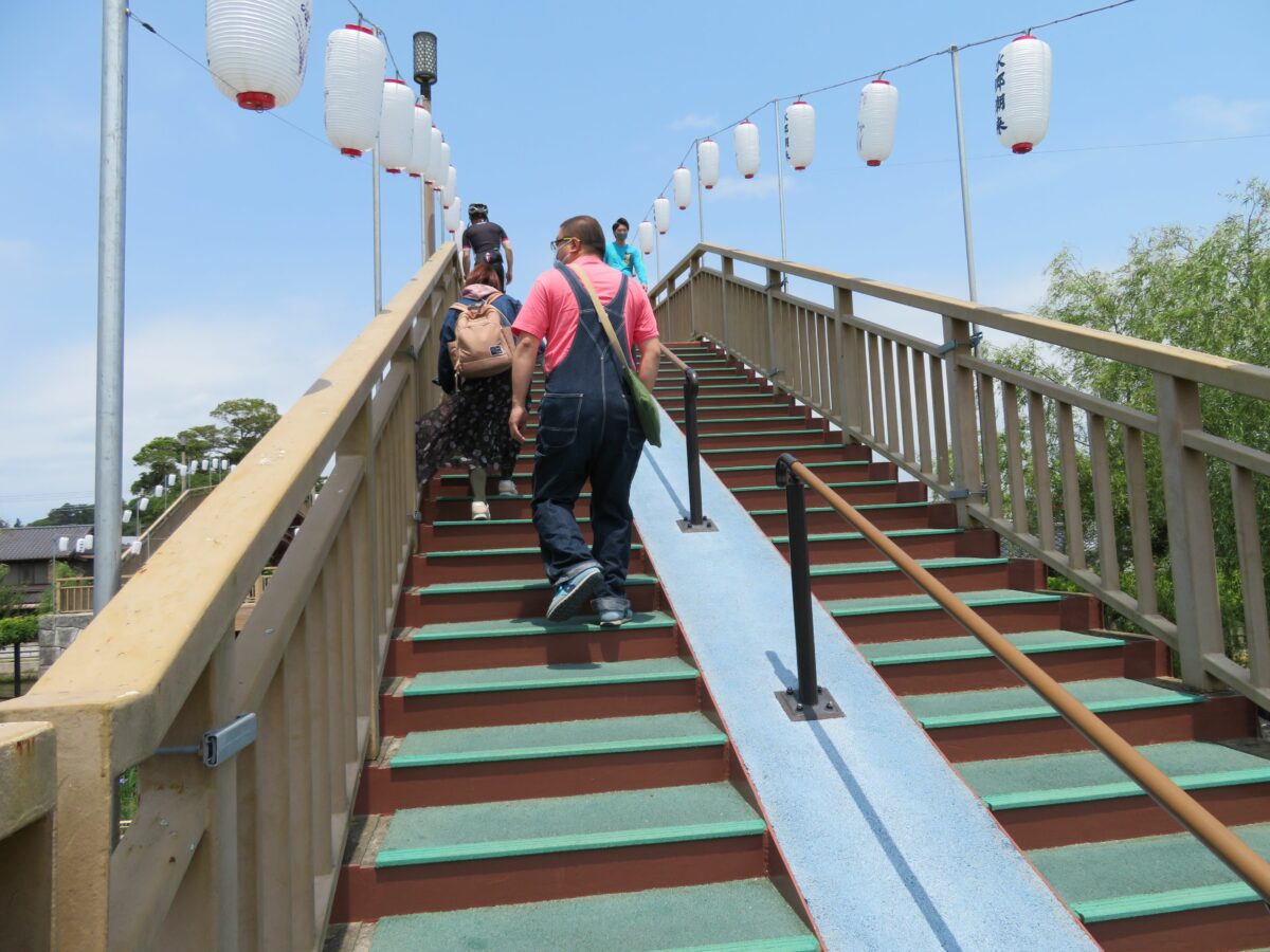 中央の橋の下には、潮来笠の歌碑と潮来の伊太郎の像が設置されています。花村菊江の「潮来花嫁さん」に加えて、橋幸夫が「潮来笠」で潮来を歌ったのです。記念碑ばかりでなく、園内では浴衣姿のスタッフが記念撮影に応じてくれます。