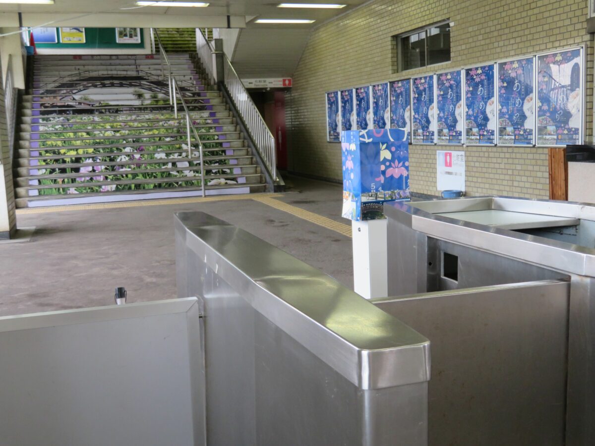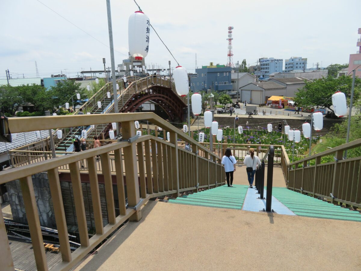 「水郷潮来あやめまつり」の会場は、潮来市の市街地を流れ利根川に注ぎ込む前川沿いを整備した「水郷潮来あやめ園」です。公共交通機関を利用して訪れる場合は、JR鹿島線の潮来駅が最寄り駅となります。駅からは西方に200メートル足らずです。「水郷潮来あやめまつり」の開催期間中には、構内の壁をポスターが隙間なく掲示されます。改札口からプラットホームに向かう階段も、あやめの花が彩っているかのようです。駅舎の中には「潮来花嫁さん」のフォトパネルが設置されています。