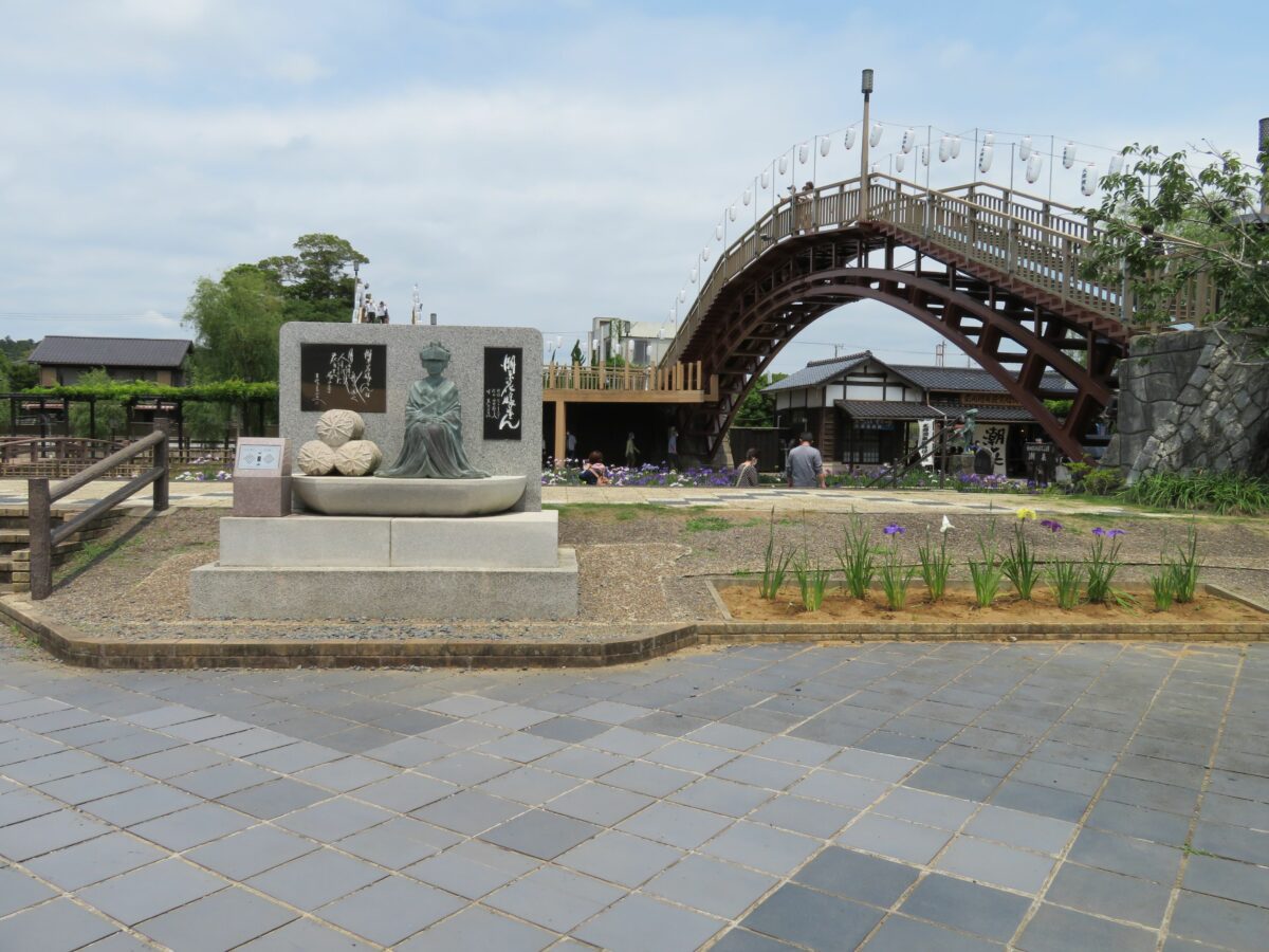 中央の橋の下に設置される潮来笠の歌碑と潮来の伊太郎の像