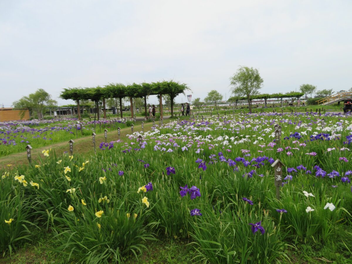 約8ヘクタールのパークには、江戸、肥後、伊勢系など約400品種、約150万本の花菖蒲が植栽されています。入口を入ってすぐのあやめ広場からは、360度のパノラマで花菖蒲を鑑賞することができ壮観です。