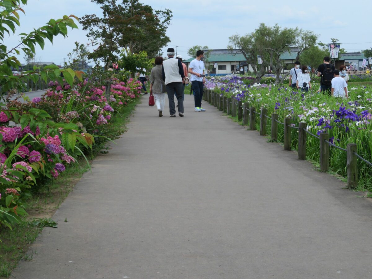 与田浦沿いの園路を左右から彩る花菖蒲とアジサイ