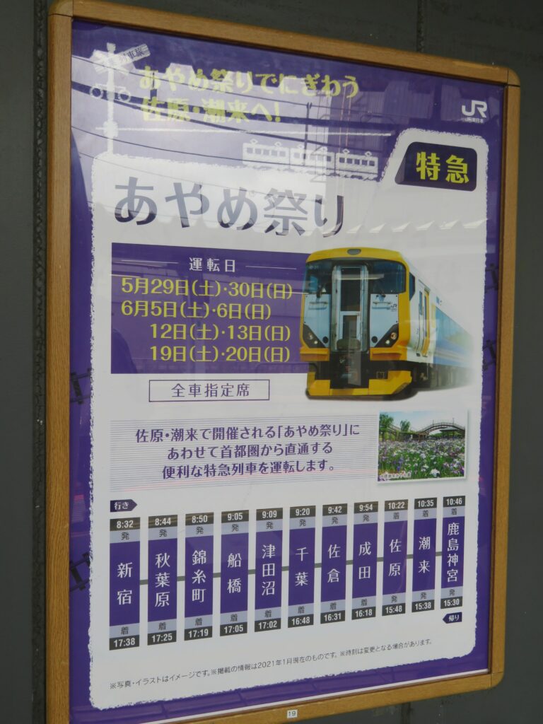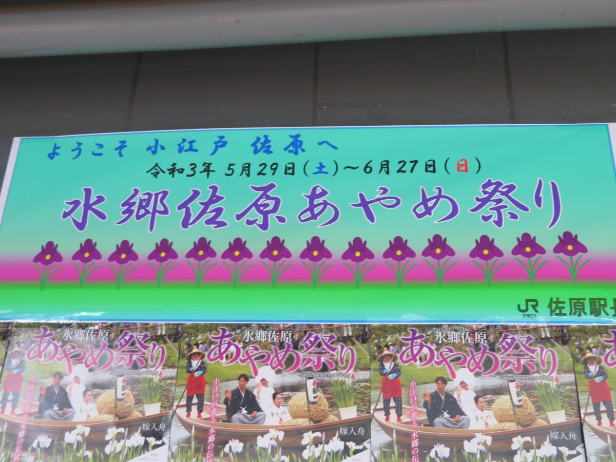 JR成田線の佐原駅に掲示される「水郷佐原あやめ祭り」の案内