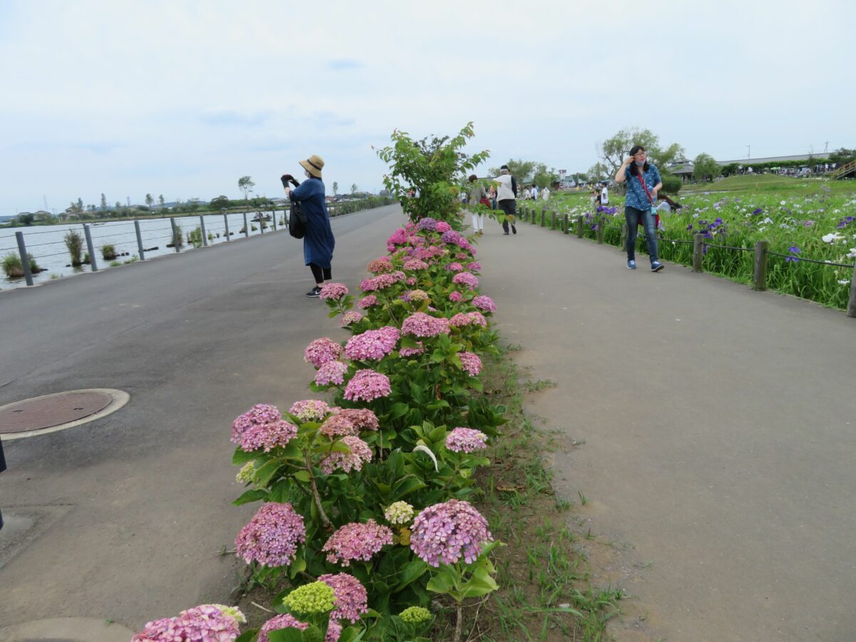 与田浦沿いの園路にはアジサイが列になって花菖蒲に異なる彩りを添えています。