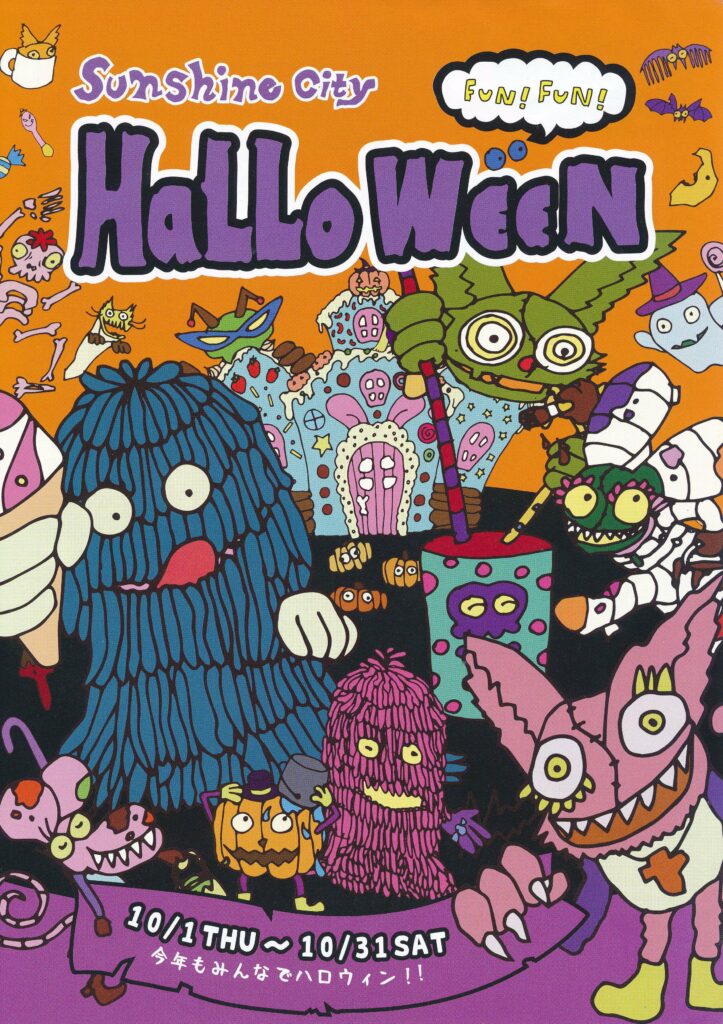 「サンシャインシティ・ファンファンハロウィン」では、専門店街のアルパを中心にサンシャインシティ全体にハロウィンの雰囲気が漲ります。サンシャインシティの正面入口の壁面には、ハロウィンのキャラクターが描かれ、格好のフォトスポットとなっています。