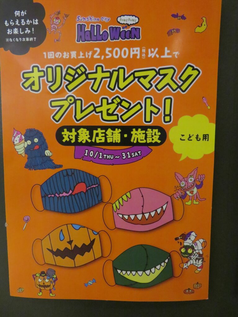 サンシャインシティ入口地下の動く歩道の頭上にはハロウィンのポスターが等間隔で吊るされ、気分を盛り上げながら専門店街のアルパに向かうことができます。アルパの各フロアの天井からもハロウィンの雰囲気が体に伝わってくるようです。アルパでは対象店舗で1会計2,500円(税込)以上のショッピングをすると、子ども用の「モンスターなりきりマスク」をもらえるプレゼント企画が実施されています。
