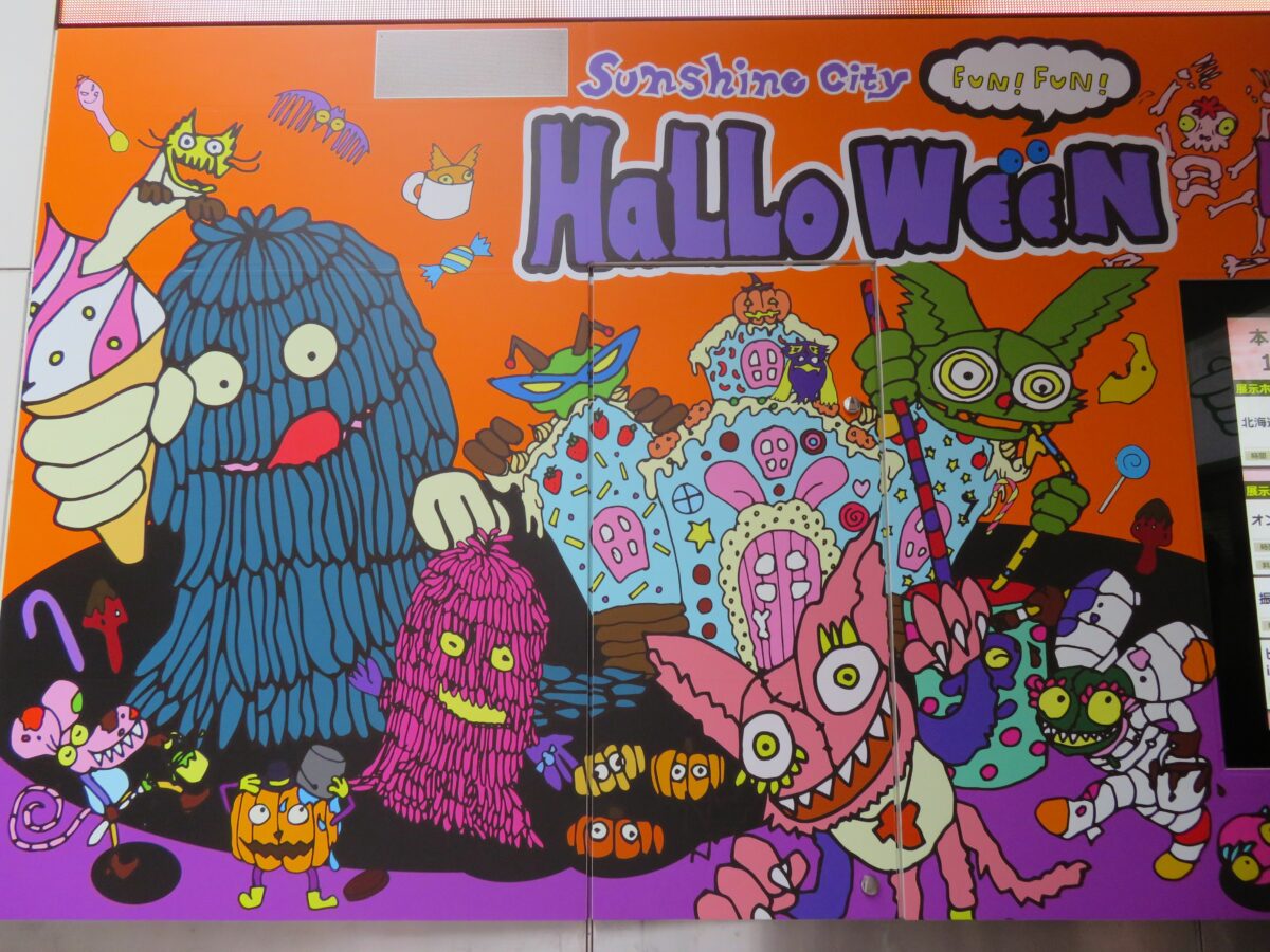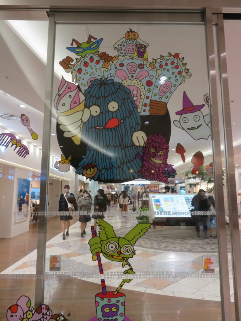 サンシャインシティの入口の壁面に描かれるハロウィンのキャラクター