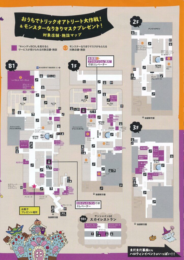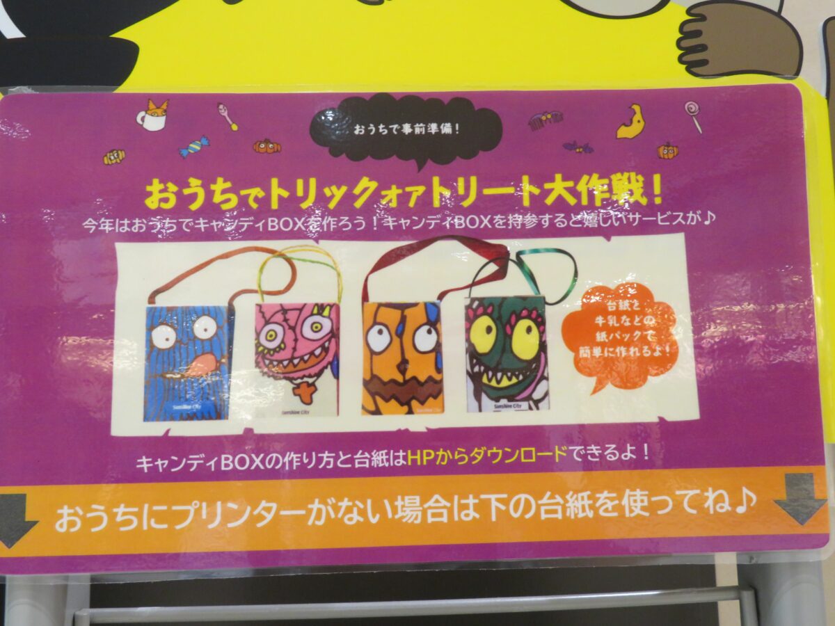 「サンシャインシティ・ファンファンハロウィン」では、「おうちでトリック オア トリート大作戦!」の企画が実施されています。公式ウェブサイトで台紙をダウンロードし、キャンディBOX作り、アルパ地下1階の大通り持っていくと、お菓子のプレゼントがあるのです。