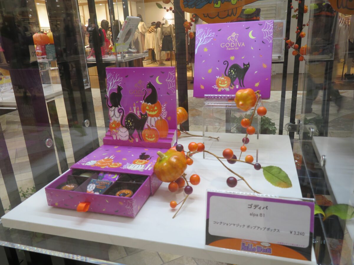 アルパ地下1階の大通りのお菓子のプレゼント会場には、アルパの専門店で販売しているハロウィングッズがショーケースで紹介されています。