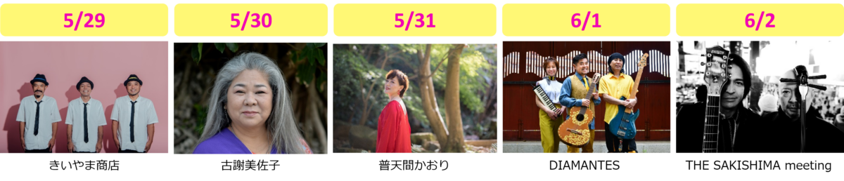 サンシャインシティのランドマークともなっている噴水広場では、会期中、豪華アーティストたちのライブが開催されます。今年亡くなった世界的音楽家・坂本龍一とワールドツアーを回り、ネーネーズとして沖縄民謡をポピュラーにした立役者である古謝美佐子や、アルベルト城間率いるDIAMANTES、石垣島出身、人気のエンターテインメントバンド「きいやま商店」などの登場で、盛り上がること請け合いです。