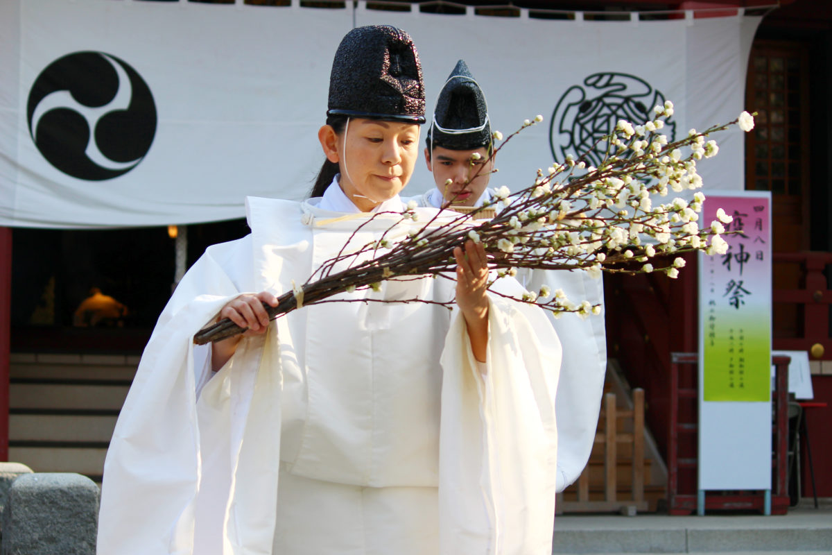 社殿の前に進み、まず行われるのは「四方鎮の儀(しほうしずめ の ぎ)」!花の咲いた桃の枝を持っての登場です!