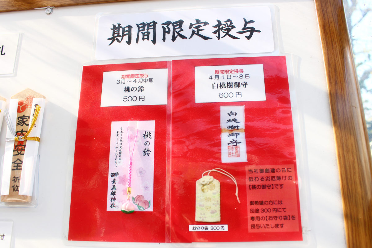 桃のお守り「白桃樹御守」や、桃の形を模った「桃の鈴」とかわいくご利益がいただけるものが揃っています!