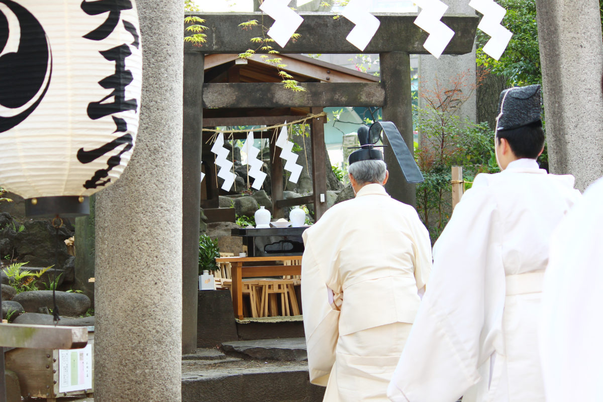 四方鎮の儀と燻桃が終わると、最後は境内にある富士塚の麓の瑞光石(ずいこうせき)へお供えを行います。鳥居の奥にある石が瑞光石ですが、素戔雄神社の起源になった石なんだとか!延暦14年(795年)に修験道で有名な役小角の弟子の黒珍(こくちん)と言う方が、この石を祀ったところから神社の創建になったそうです。