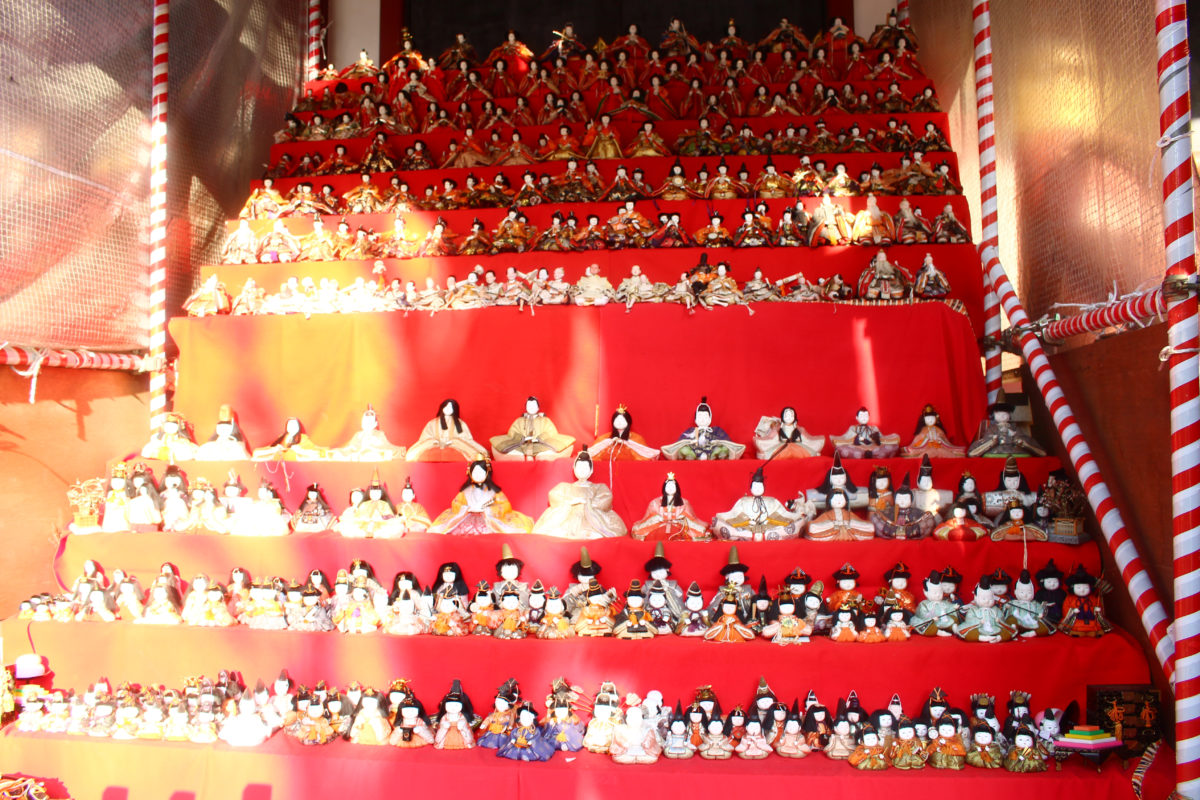 境内を見渡すと、桃の節句に合わせたくさんのひな人形が披露されています!こちらは見事なひな壇ですね!