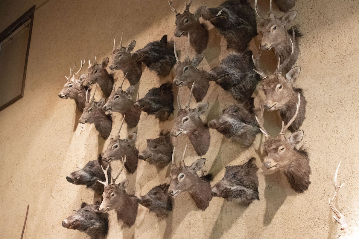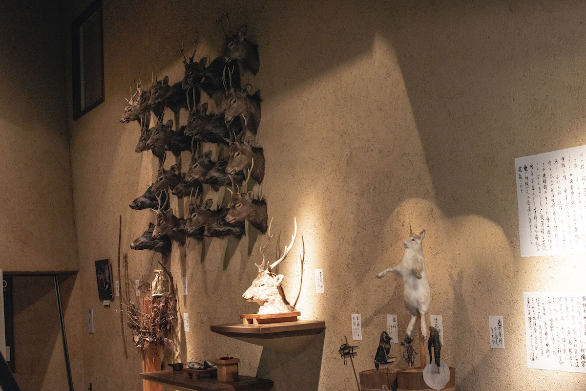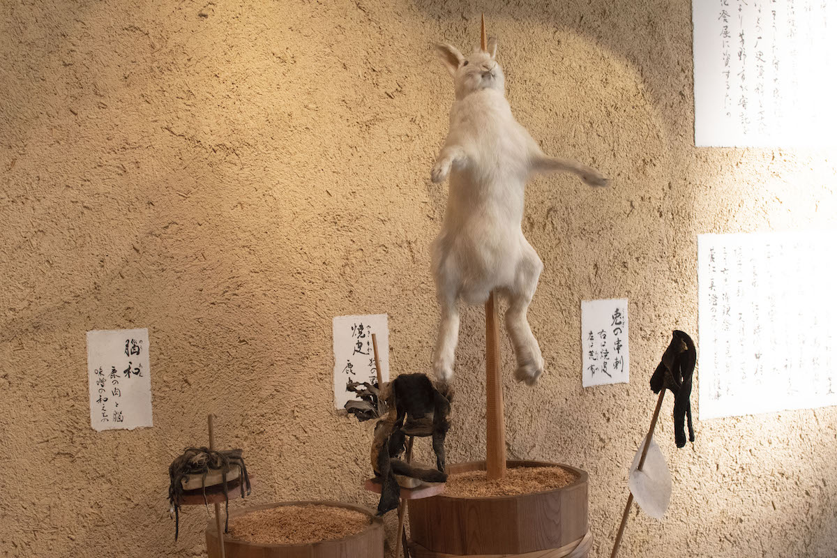 こちらは、うさぎの串刺しや猪の頭皮、鹿皮です。とても衝撃的な展示ですね..。