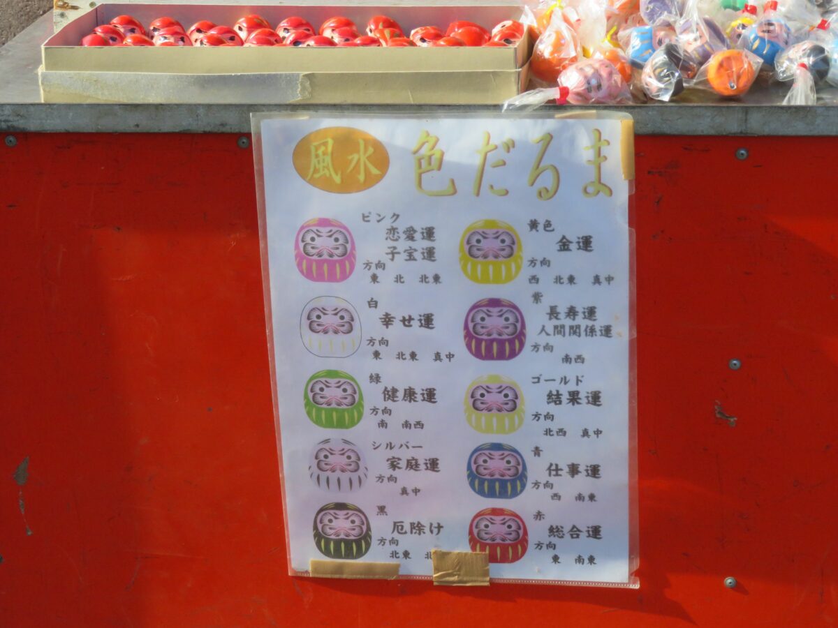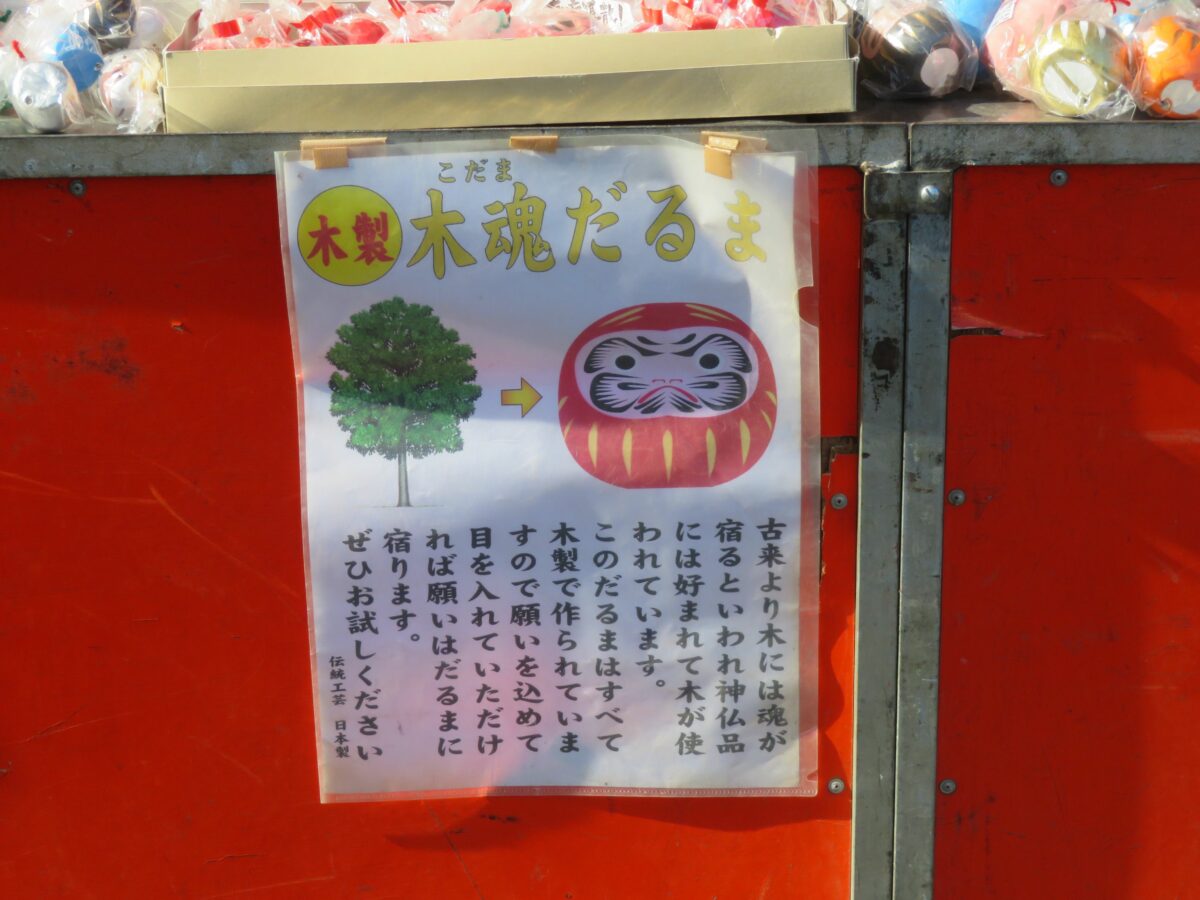 「鈴谷のだるま市」の規模は大きなものではなく近年、市に参加するのは2店舗となっています。店舗数は少なくても、大きさや色彩の種類は他の「だるま市」に引けを取ることはありません。本堂の正面のテントには「木魂だるま」が並びます。木には魂が宿ると言われ、目を入れれば願いがしっかりとだるまに宿ることでしょう。