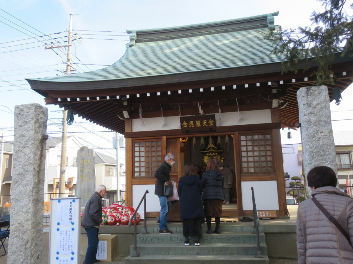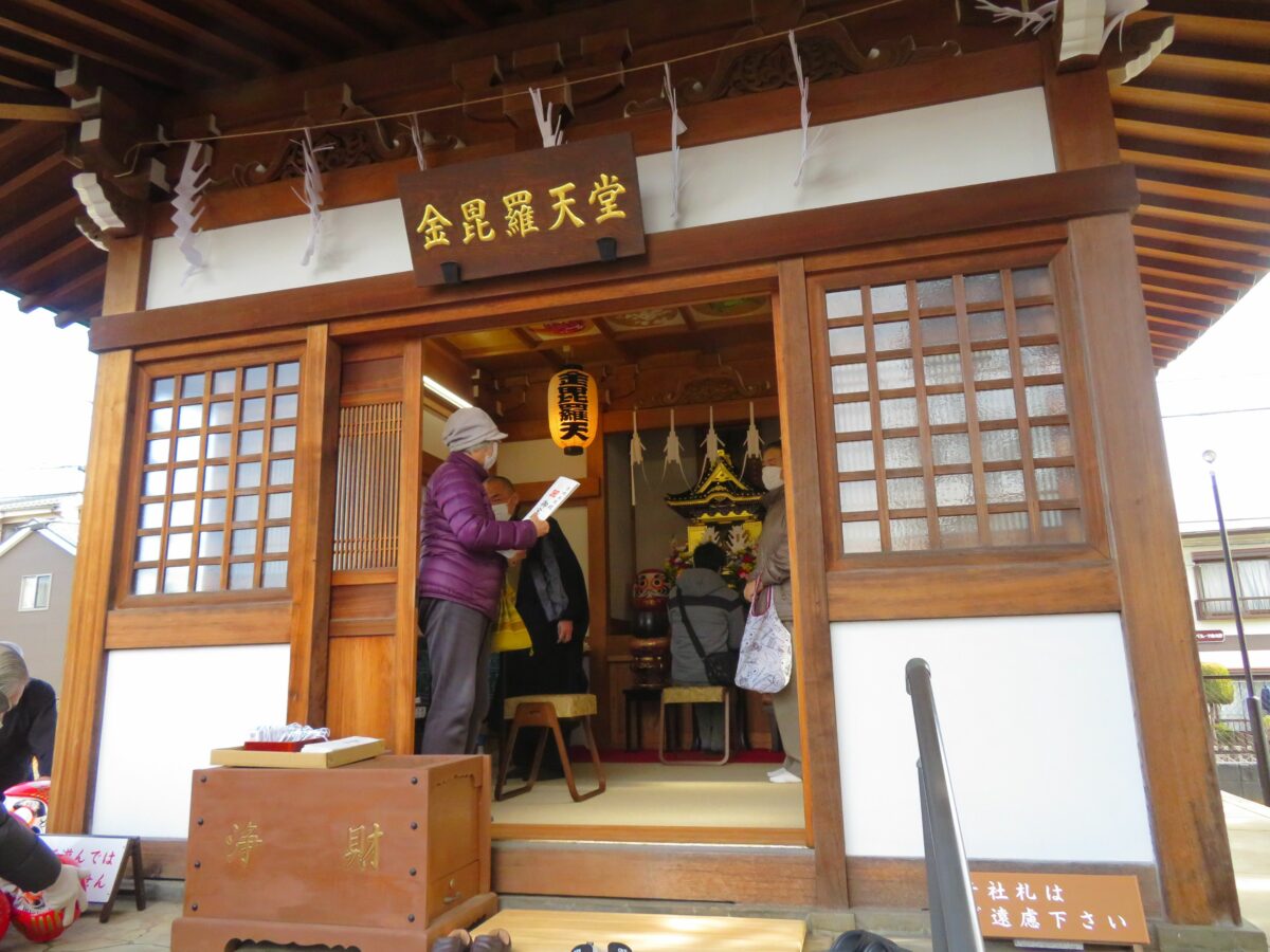 金比羅天堂は、JR埼京線の南与野駅から、県道165号線を北に1キロ足らずのところに堂を構えています。堂内には金毘羅天立像が安置され、「鈴谷のだるま市」の開催日には入口で大小のだるまが参拝者を出迎えてくれます。