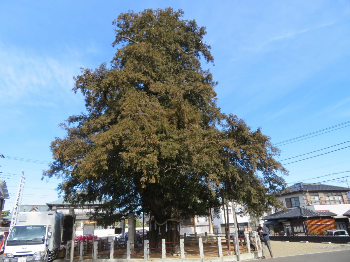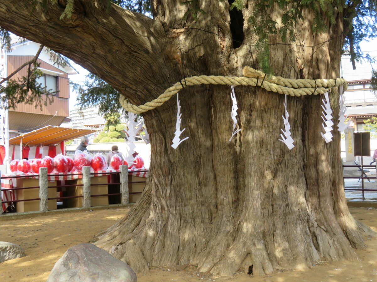 「鈴谷のだるま市」の会場で圧倒的な迫力で視界に入るのは、金毘羅天堂の神木の「与野の大カヤ」です。「榧木金比羅」と呼ばれることもあり、国の天然記念物に指定されています。平安時代の中期に植えたものと伝えられ、室町時代には関東随一の巨木として旅人の道標となっていたと伝わります。全高約21.5メートル、幹まわり約7メートル、根まわり約13.5メートルの大木は与野のシンボルとなっています。
