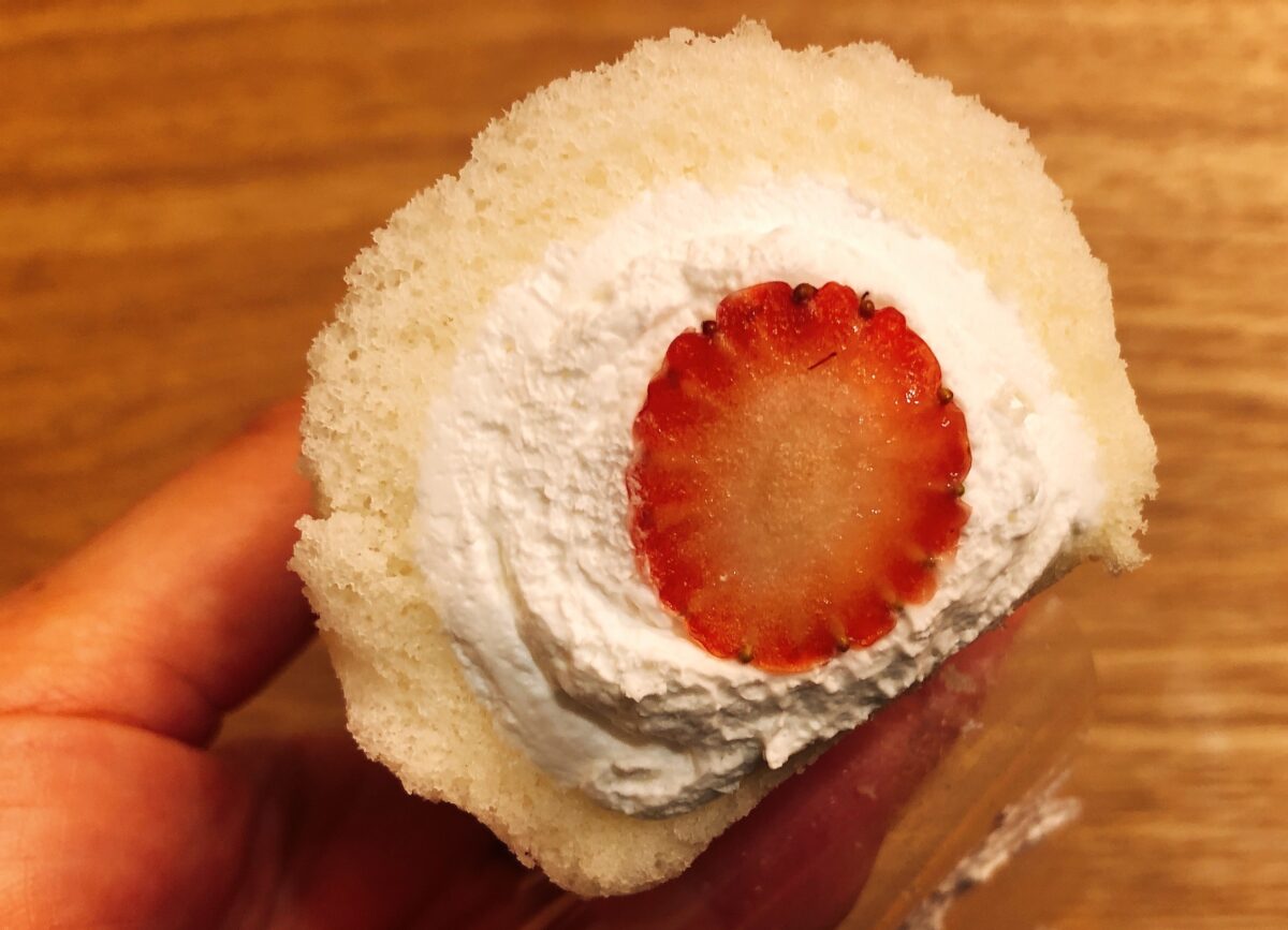 お次に紹介するのは「節分ロール 苺&バナナ」(税込450円)。真っ白でふわふわなスポンジに、バナナと苺が包まれた恵方ロール。スポンジもフワッフワ、クリームも軽い食感なのでスイーツ好きであれば一本まるまる丸かじりがオススメ! 苺は小ぶりなものが2粒分、バナナは2センチ程度の長さのものが2つ分入っていて、クリームたっぷりのなかでいいアクセントになっています。