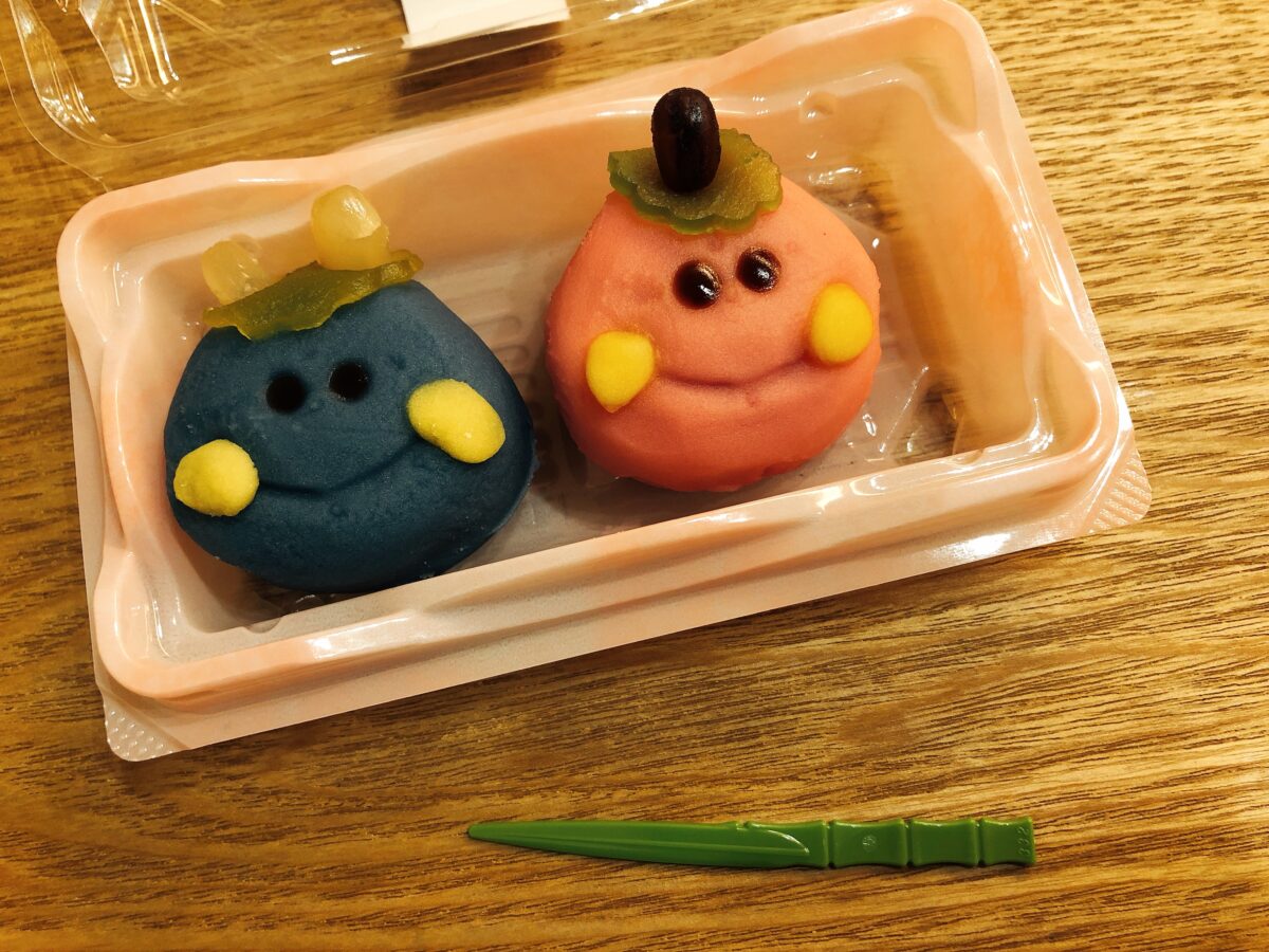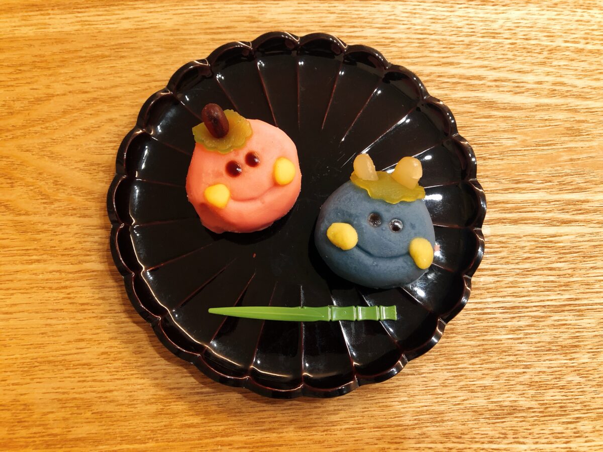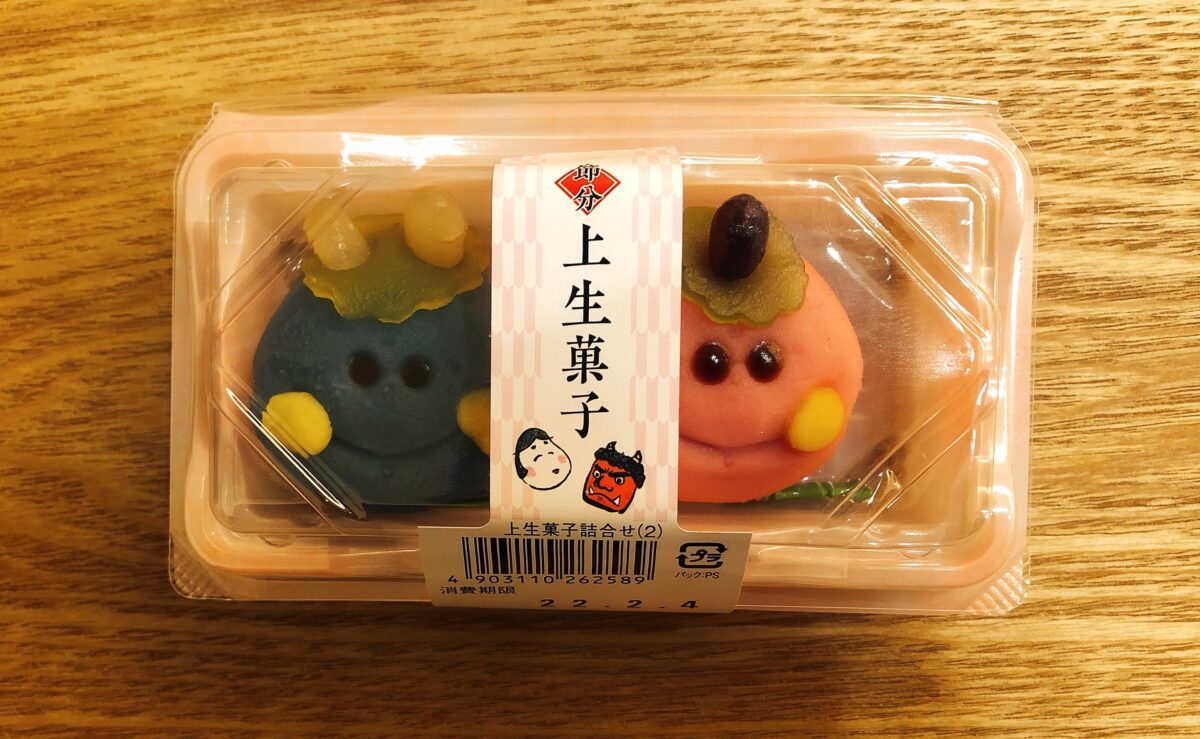 最後にご紹介するのは「節分 上生菓子」(税込438円)。全体があんこでできた正統派和菓子です。赤鬼と青鬼どちらも食べるのがもったいないほどカワイイ……!