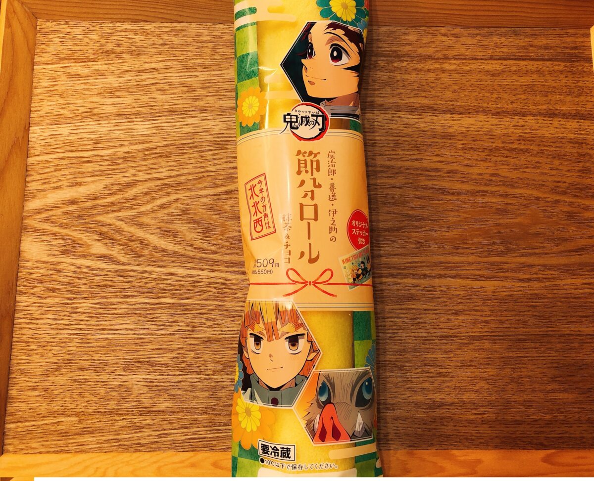 初めにご紹介するのは、ローソンと「鬼滅の刃」コラボ『「鬼滅の刃」炭治郎・善逸・伊之助の節分ロール』(税込550円)。長さ30センチにもわたる、超ロングなロールケーキ。緑の抹茶クリーム(炭治郎)・黄色のスポンジ(善逸)・茶色のチョコクリーム(猪之助)の、キャラクターをイメージさせるフレーバーになっています。