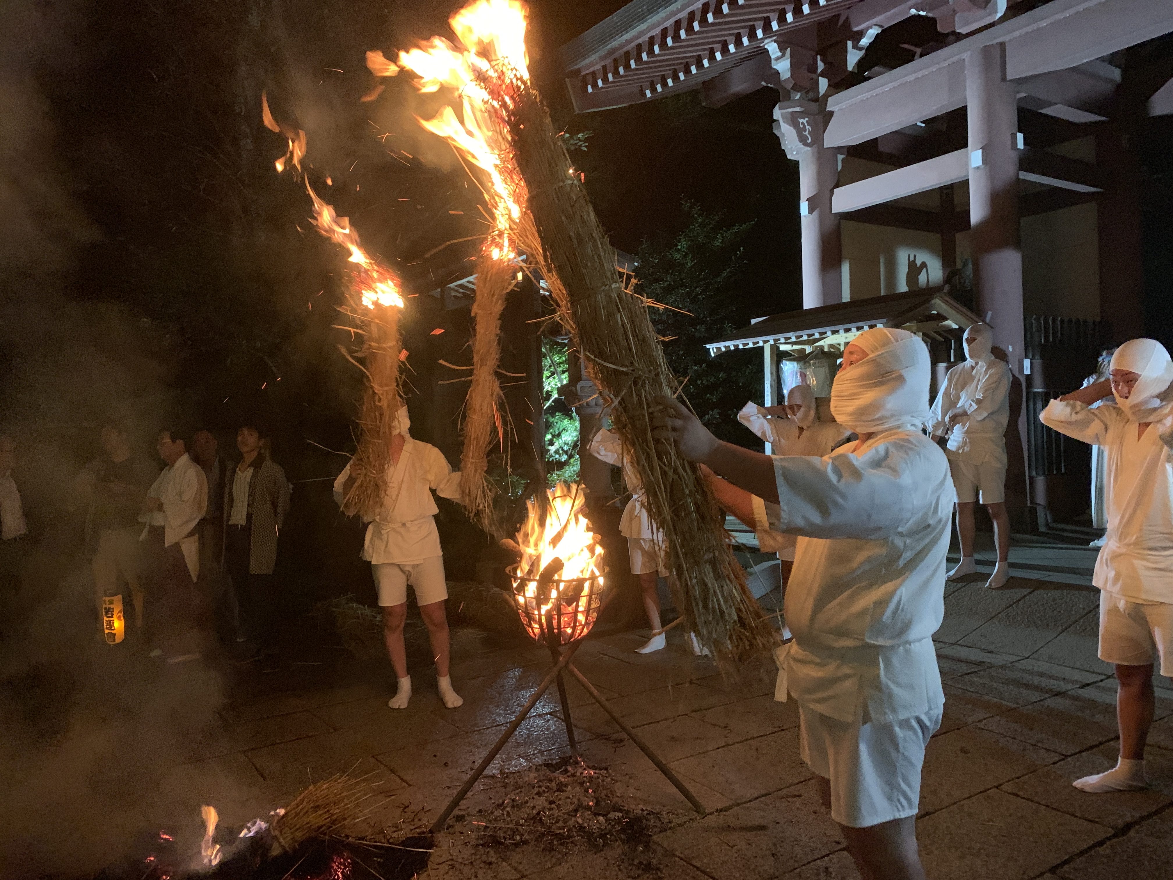 毎年9月に茨城県の大宝神社で行われる「タバンカ祭」。畳と鍋で火を防いだ故事を模倣し、火の粉を浴びると火防の御利益があると言われておるぞ。松明を振り回す「奉仕者」は火の呼吸の使い手じゃな。#タバンカ祭 #好きな祭りの話をしよう pic.twitter.com/fjEEr8HgZS