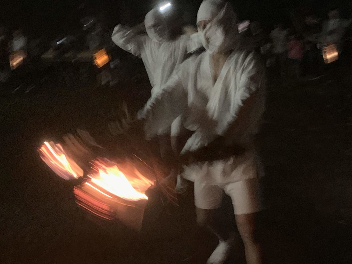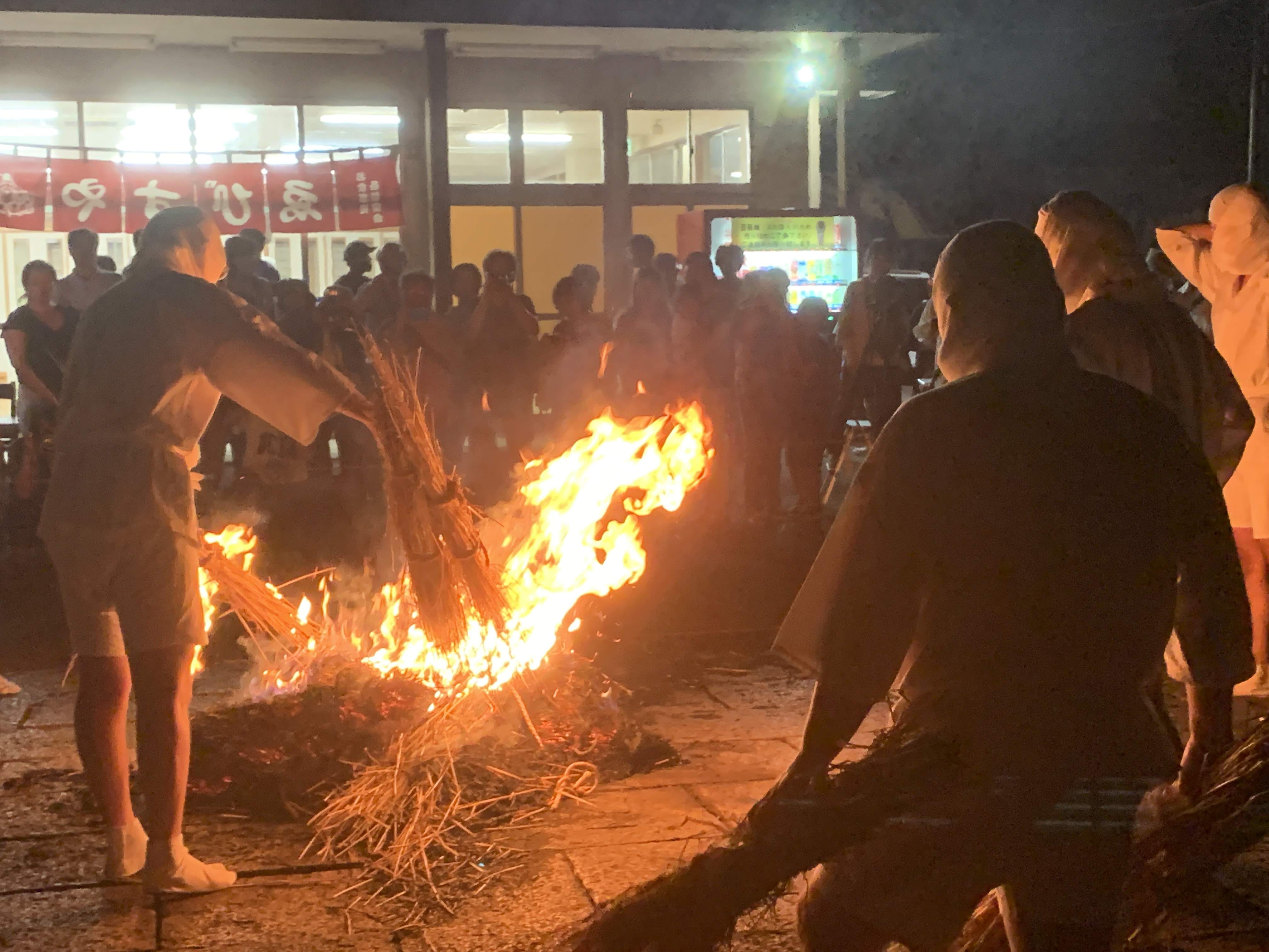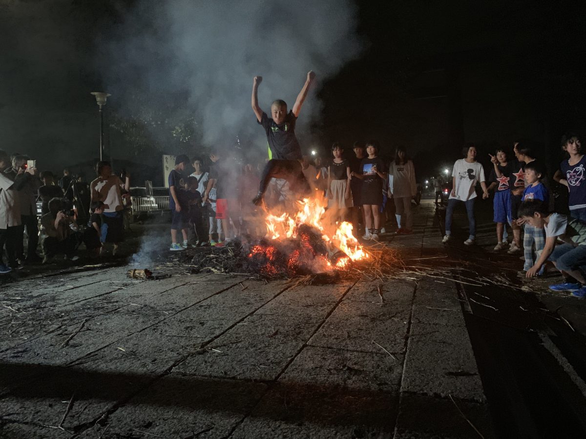 一種の度胸試しなのか、三島由紀夫の『潮騒』(「その火を飛び越して来い」)ばりに地元の子どもたちが焚火をジャンプして飛び越えてくるわ、飛び越えてくるわ。田舎育ちの私としては「昔、こういうのよくやったなぁ」とほっこり懐かしい気持ちになりました。