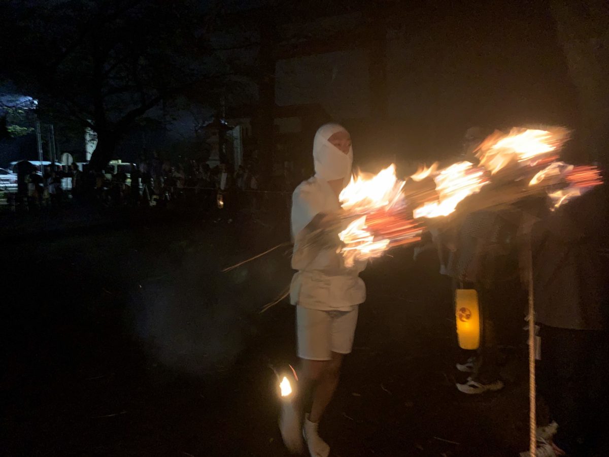 「あっぶね。もう少しで眉毛が全焼するところだったぜ!」なんてことはもちろんなく、程よい感じで松明が目の前を通り過ぎていきました。さすが、その辺は配慮が行き届いています。ちょっと火の粉を浴びたぐらい(それにしても奇祭ハンターをやっていると火の粉やら白い粉やらよく浴びるな)。