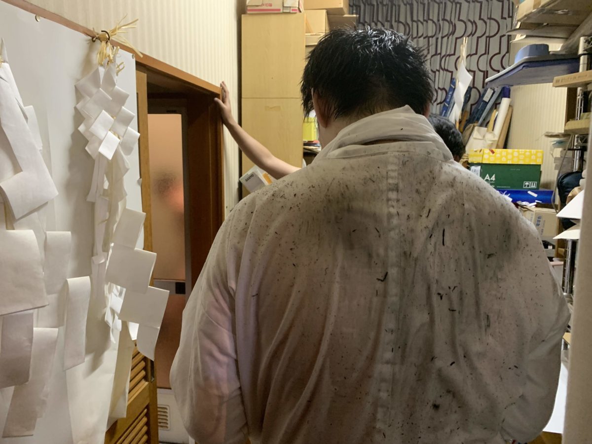 誰もケガすることもなく、タバンカ祭が無事に終了しました。背中が祭りの苦労を語っています。