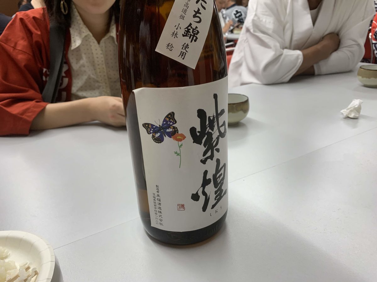 打ち上げで振る舞わされた下妻市の地酒「紫煌」。下妻市に生息する国蝶オオムラサキが煌(きら)びやかに舞う様子をイメージして名付けられたとのこと。