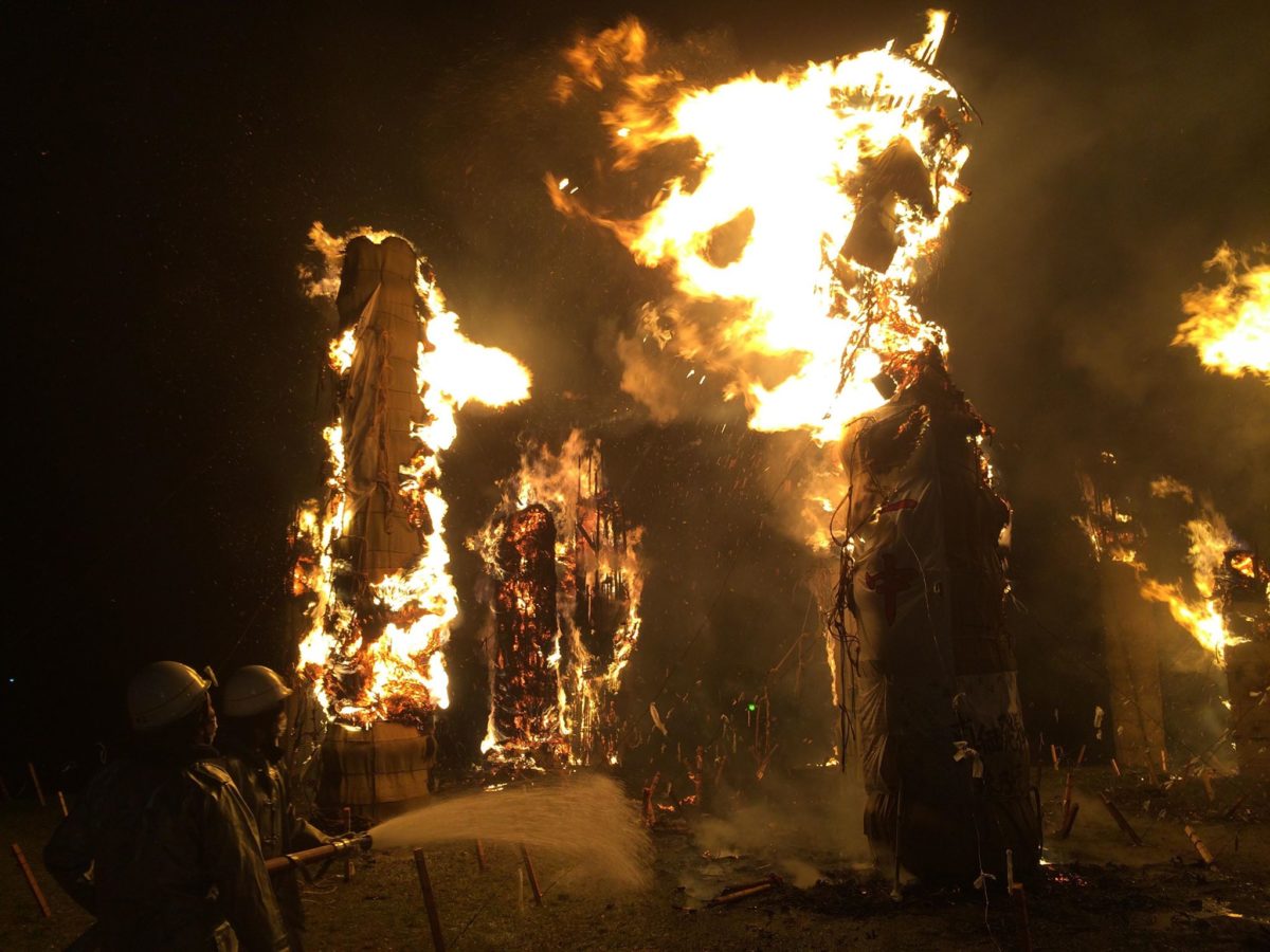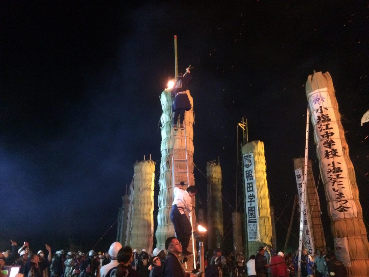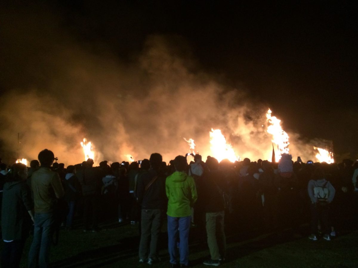 10mに延長した脚立を灯け手(結構な割合で女の子!!)がホイホイのぼり、火種を落としたらあっという間に大炎上である。