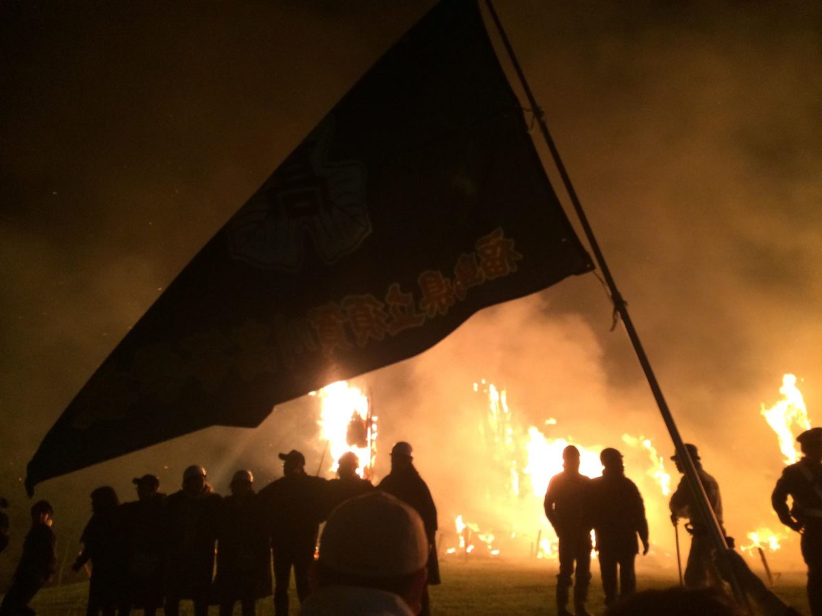 みるみる内に視界は火の海に。地元の中学生の応援合戦(!?)も始まり、ボルテージはいきなり最高潮である。