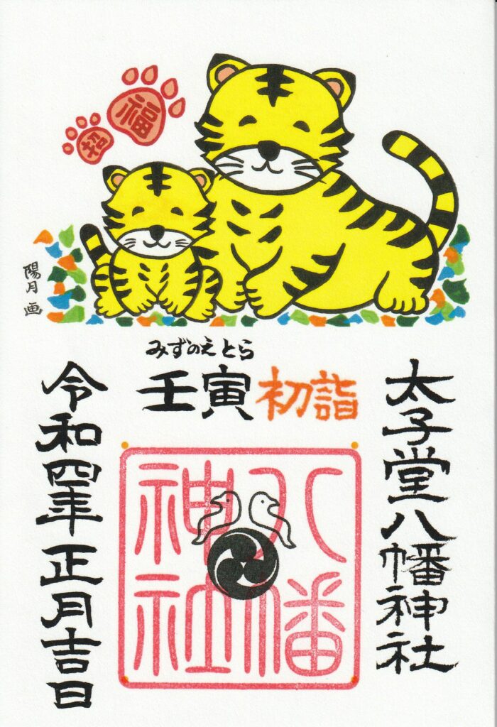 太子堂八幡神社では季節の行事ごとにオリジナリティーが溢れる御朱印を頒布しています。1月下旬に訪れて案内ボードを眺めると目移りして、頂く御朱印を決めかねる参拝者も多いようです。新年を迎え最初の行事は初詣です。太子堂八幡神社の初詣期間限定の御朱印には、干支の姿が描かれます。そればかりか、見開きの2倍サイズの紙面には、お守りのような木札が挟まれます。