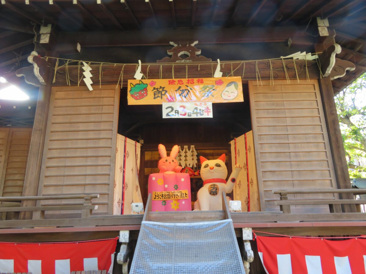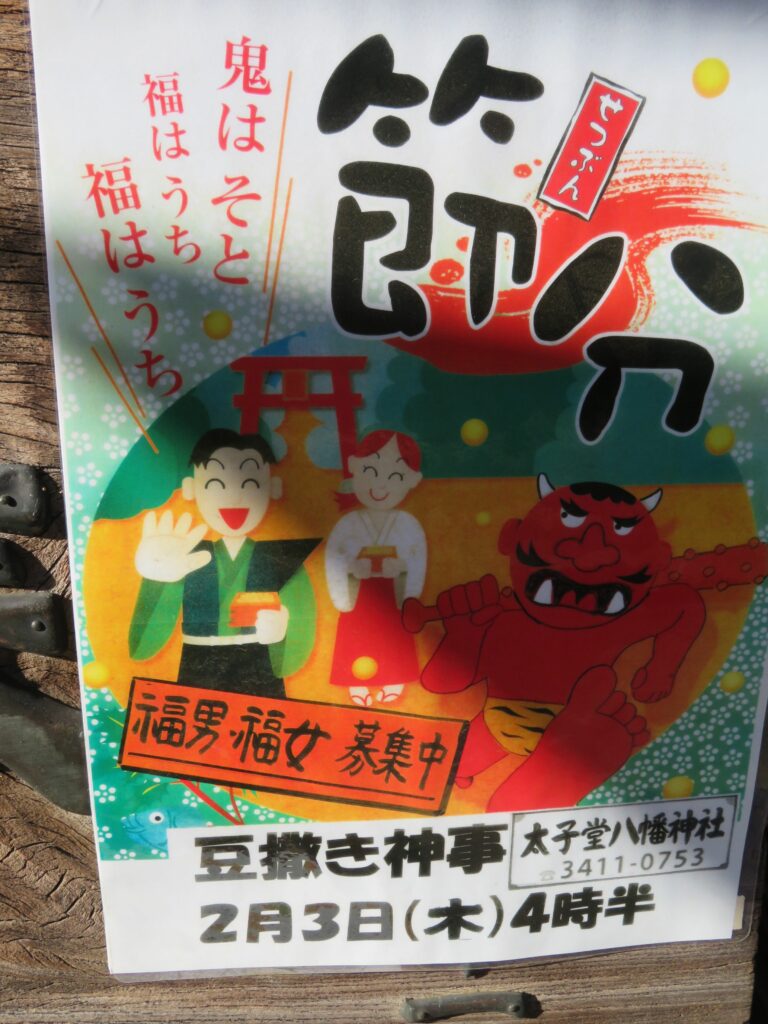 1月も下旬を迎えると翌月の節分の準備が始まります。太子堂八幡神社では当然のように、節分の御朱印の頒布が行われます。社務所の小屋で飼われる「幸せうさぎ」が鬼に向かって投げる縁起豆がセットになっているので、一体で二度美味しいのです。