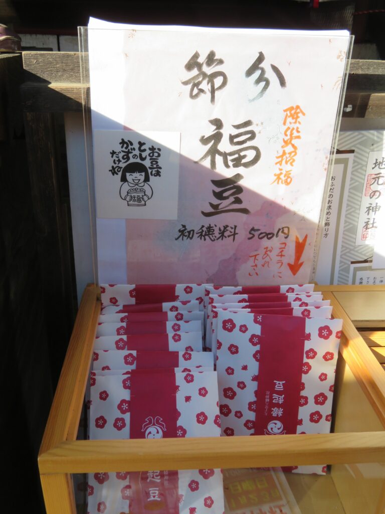 社務所に準備される「節分祭・豆まき神事」の縁起豆