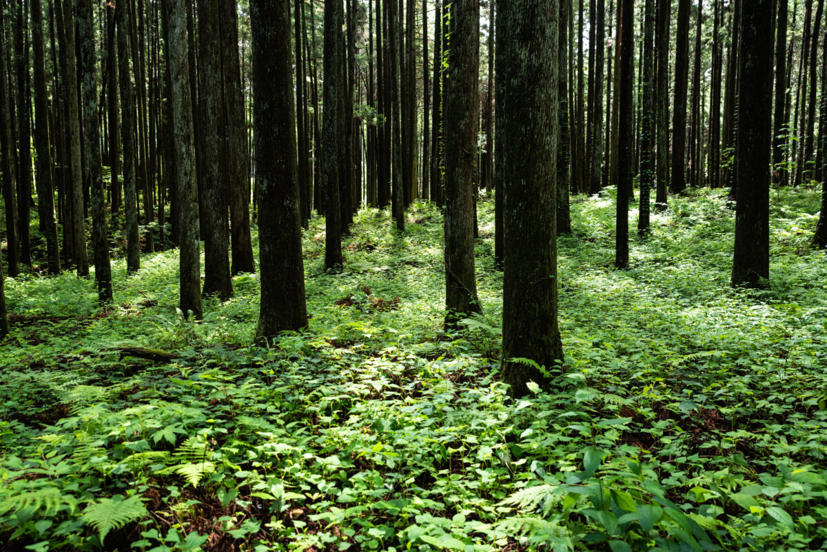 「この辺一帯は全部木でしたから。間伐もしていなかったから当時は真っ暗。自然林と違って人工林は手入れしないとダメなんですよ。杉檜って全部人工林ですから、間引いて、枝おろしをして、幹をよく見せる。そうすると健康に育つし、周りの感じもいいじゃないですか。」