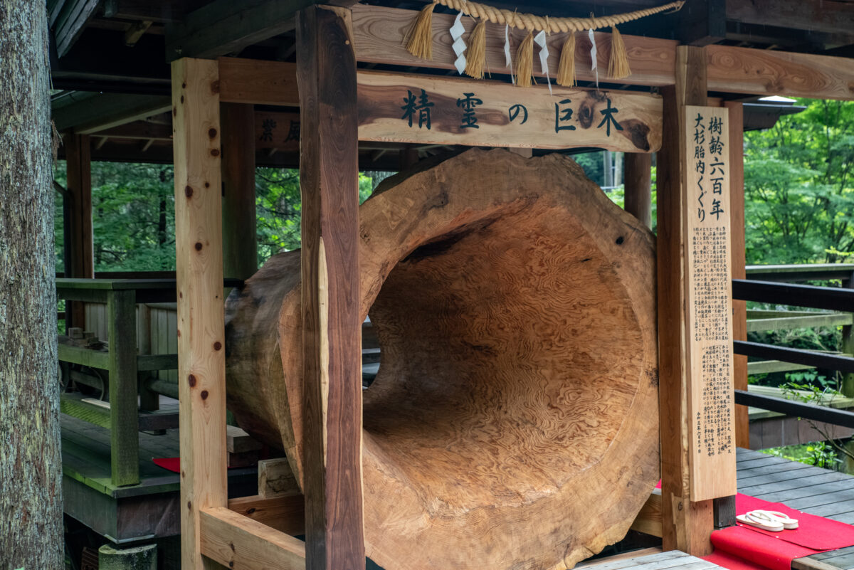 この胎内くぐりは、高龗神社が鎮座する大室地区で古くから「大杉」との屋号を持つ家にあった推定樹齢600年以上とされる杉の大木が使われ、「大室の森林をつなぐ会」の方々によって設置、奉納されました。