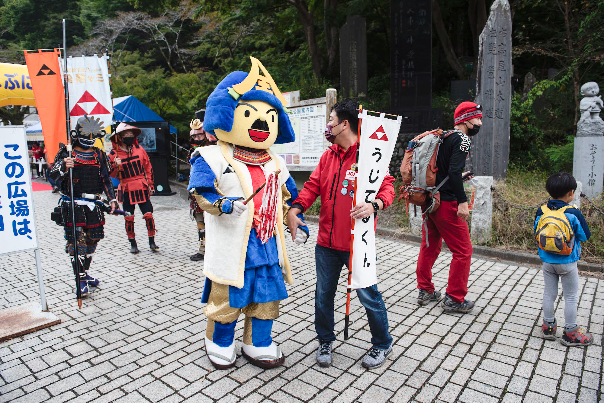 イベント会場には、北条氏照を模したゆるキャラ「うじてるくん」も登場!多くの観光客の記念撮影に応じていた。