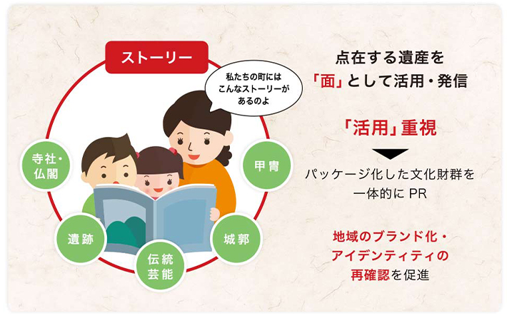つまり個々の文化財を、その町の歴史的「ストーリー」を軸に一つのつながりの中で解説することで、文化財の意味や価値、町の魅力をより分かりやすく伝える取り組みである。
