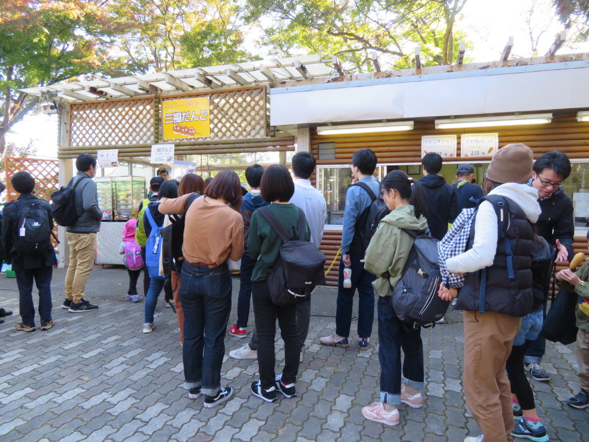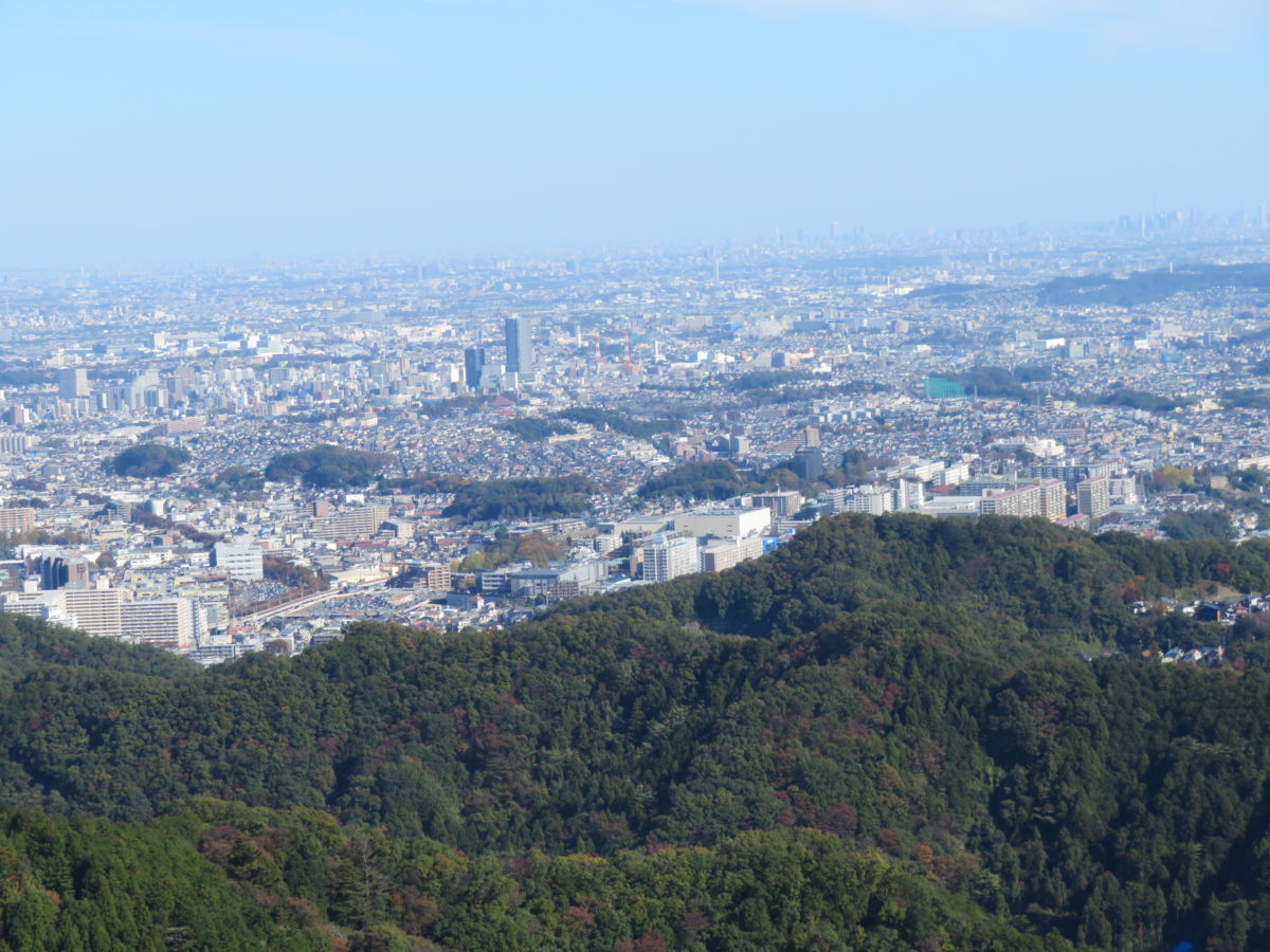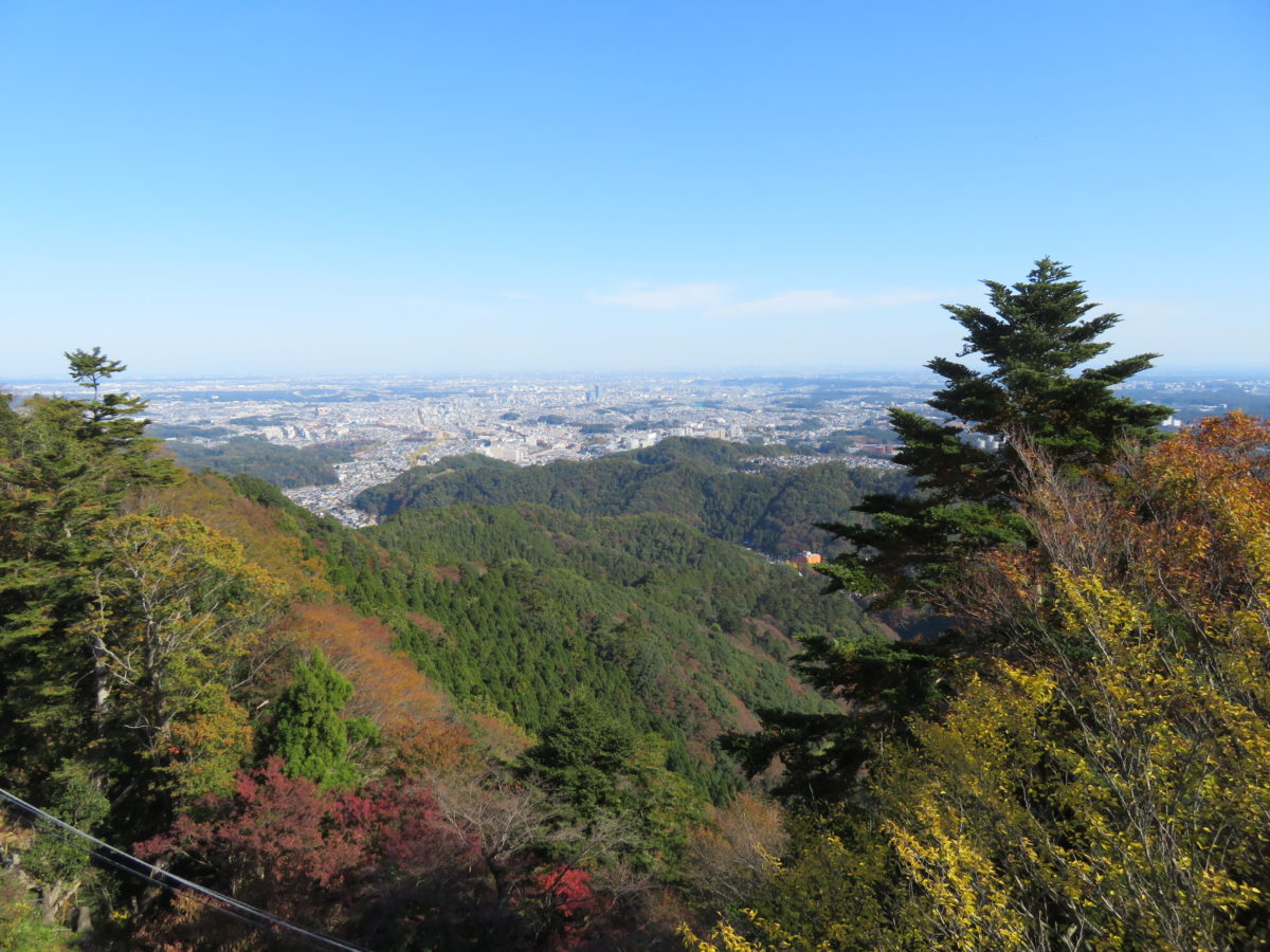 「三福だんご」や「天狗焼」を手に展望台から眺める高尾山の紅葉や関東平野
