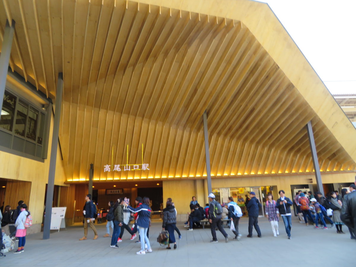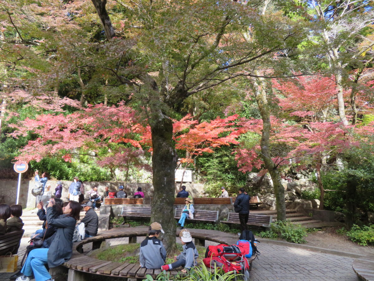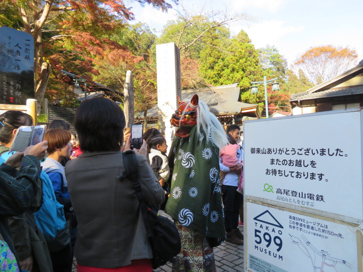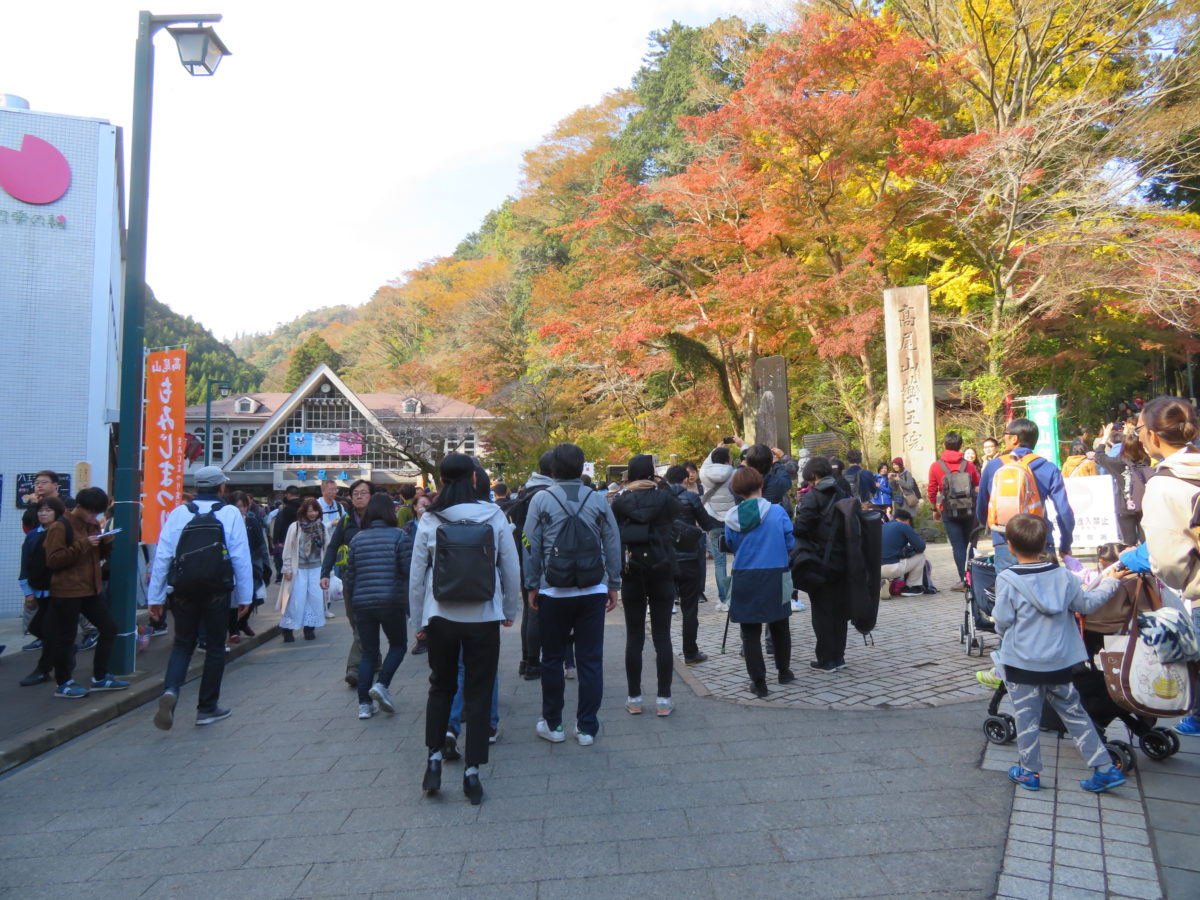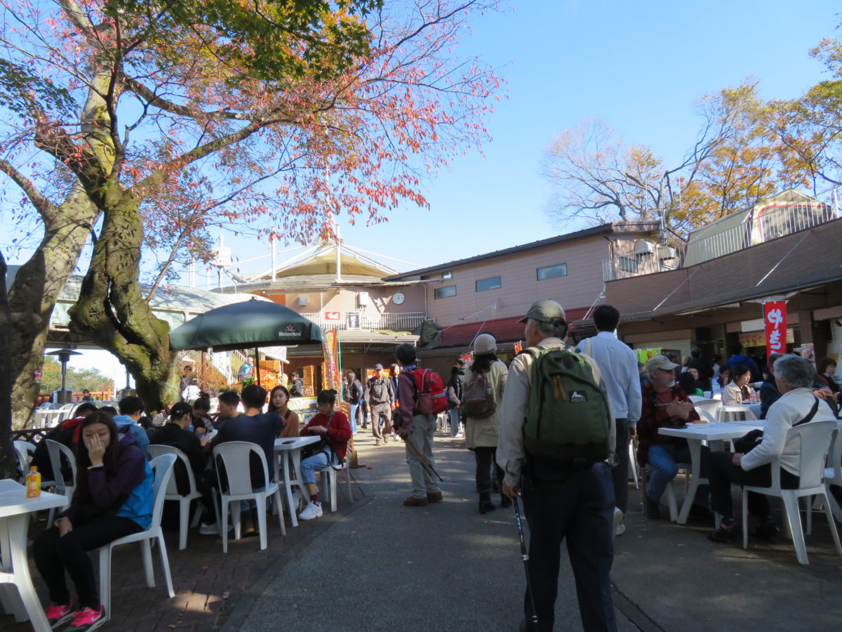 高尾山登山の起点となるのは京王線の高尾山口駅です。駅から西に数百メートルのところに高尾山が迫っています。登山のためのケーブルカーやリフトの乗場前の広場には開放感が漲り、周囲は紅葉で包まれます。「高尾山もみじまつり」の期間中には特設ステージが設置され、土日祝日を中心に獅子舞や大正琴演奏など様々なイベントが行われます。広場の周辺には商店や飲食店が軒を連ねているので、土産物の買物や食事の選択肢の幅は極めて広いです。