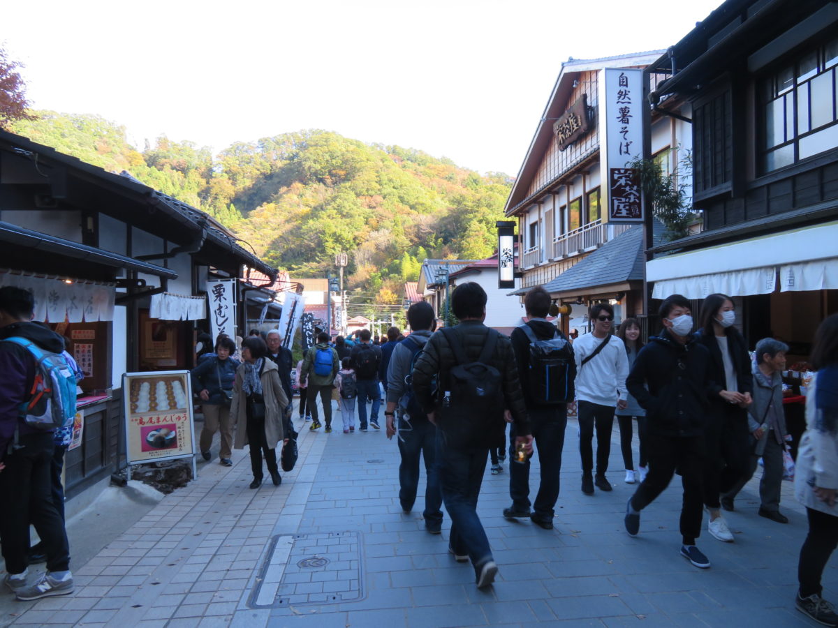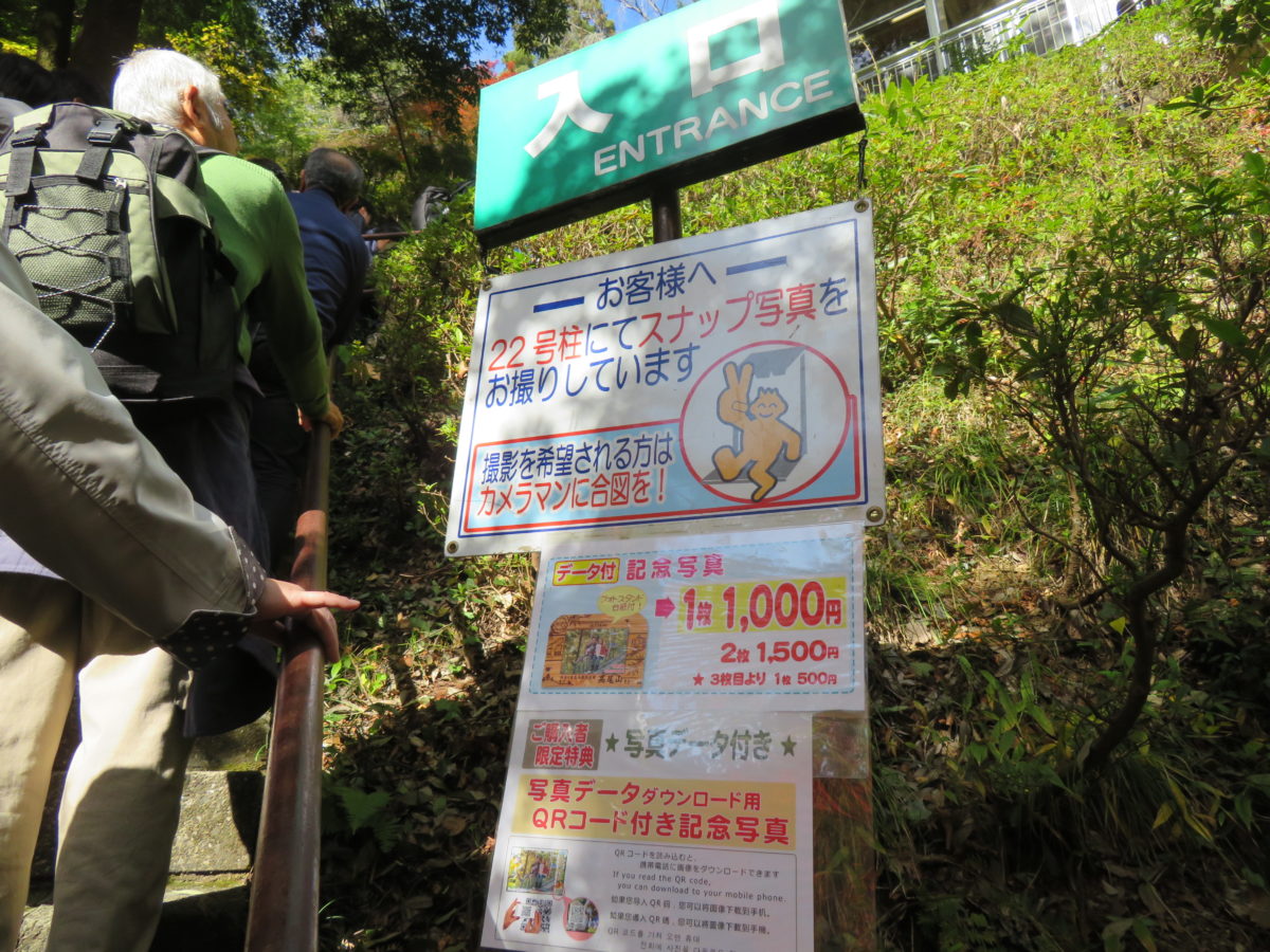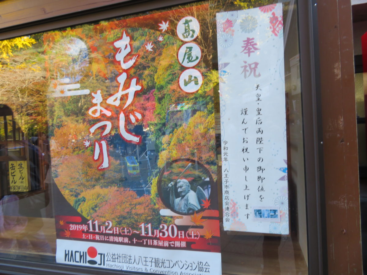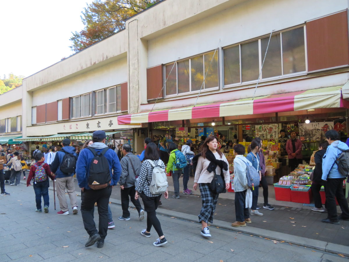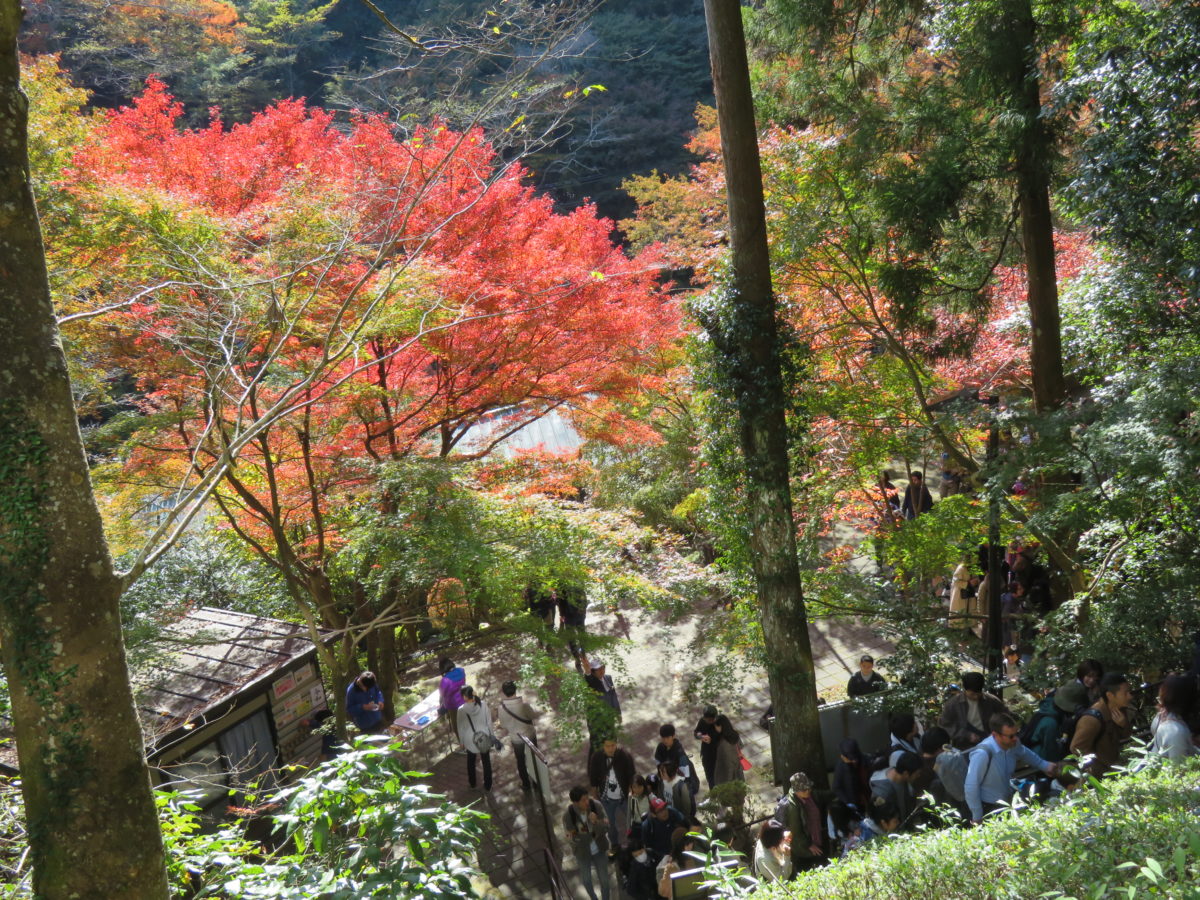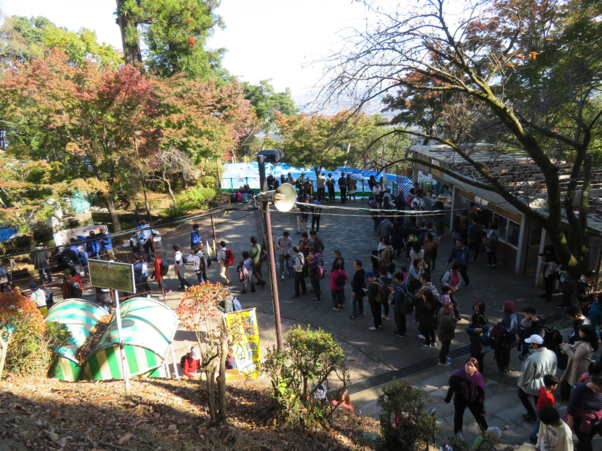 高尾山登山の起点となるのは京王線の高尾山口駅です。駅から西に数百メートルのところに高尾山が迫っています。登山のためのケーブルカーやリフトの乗場前の広場には開放感が漲り、周囲は紅葉で包まれます。「高尾山もみじまつり」の期間中には特設ステージが設置され、土日祝日を中心に獅子舞や大正琴演奏など様々なイベントが行われます。広場の周辺には商店や飲食店が軒を連ねているので、土産物の買物や食事の選択肢の幅は極めて広いです。