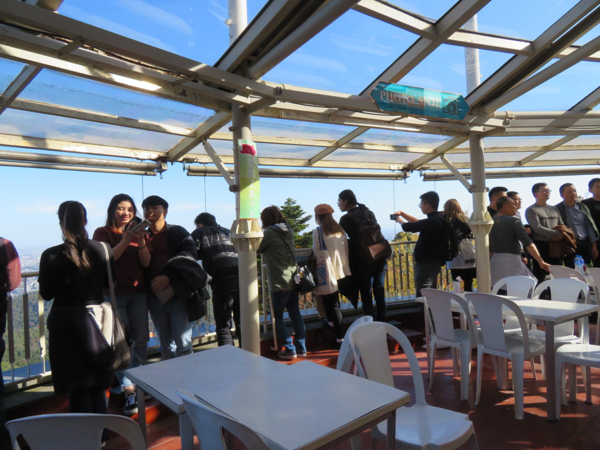 ケーブルカー及びリフトの山上駅はいずれも展望台のすぐ下に設置されています。「高尾山もみじまつり」の期間中には大勢の人々で溢れます。展望台からは高尾山の山肌の先に、関東平野が広がります。天候がよければ筑波山や、房総半島、江の島を眺めることができます。展望台下に店舗を構える高尾山スミカにはユニークな食べ物が数多く並んでいます。中でも「三福だんご」や「天狗焼」のコーナーには、長蛇の列ができることもしばしばです。