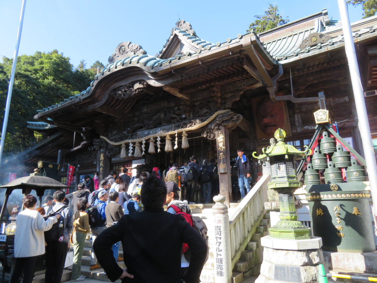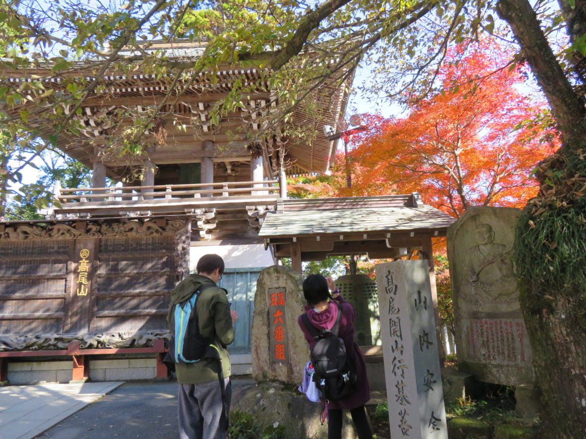 高尾山の展望台は山頂に設置されているわけではなく、ここからほとんどの人が登山道を薬王院に向かいます。薬王院は744年に聖武天皇の勅命に従って行基が開山したと伝えられています。本堂の傍らに建つ大師堂や鐘楼堂が紅葉で温かく包まれます。また境内では「天狗十穀団子」や「眼力せんべい」などの珍しい食べ物が販売されています。