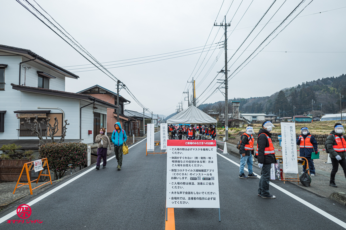 入場ゲートでは居住地などを記入した用紙の提出、検温、消毒、人数管理が行われ、実施前後の防疫が図られました。