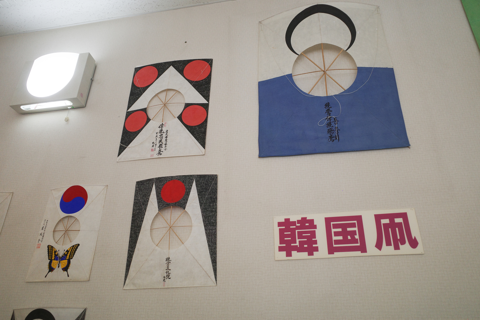 韓国の凧は「合戦凧」ともいわれ、お互いの凧の糸を切り合うという特徴がある。12月~1月にかけて行われ、厄払いなどの意味を込めて行われるようだ。風圧を少なくするため、あるいは大凧の操作性を良くするために、中心部に穴が空いているなど、機能性も高い。