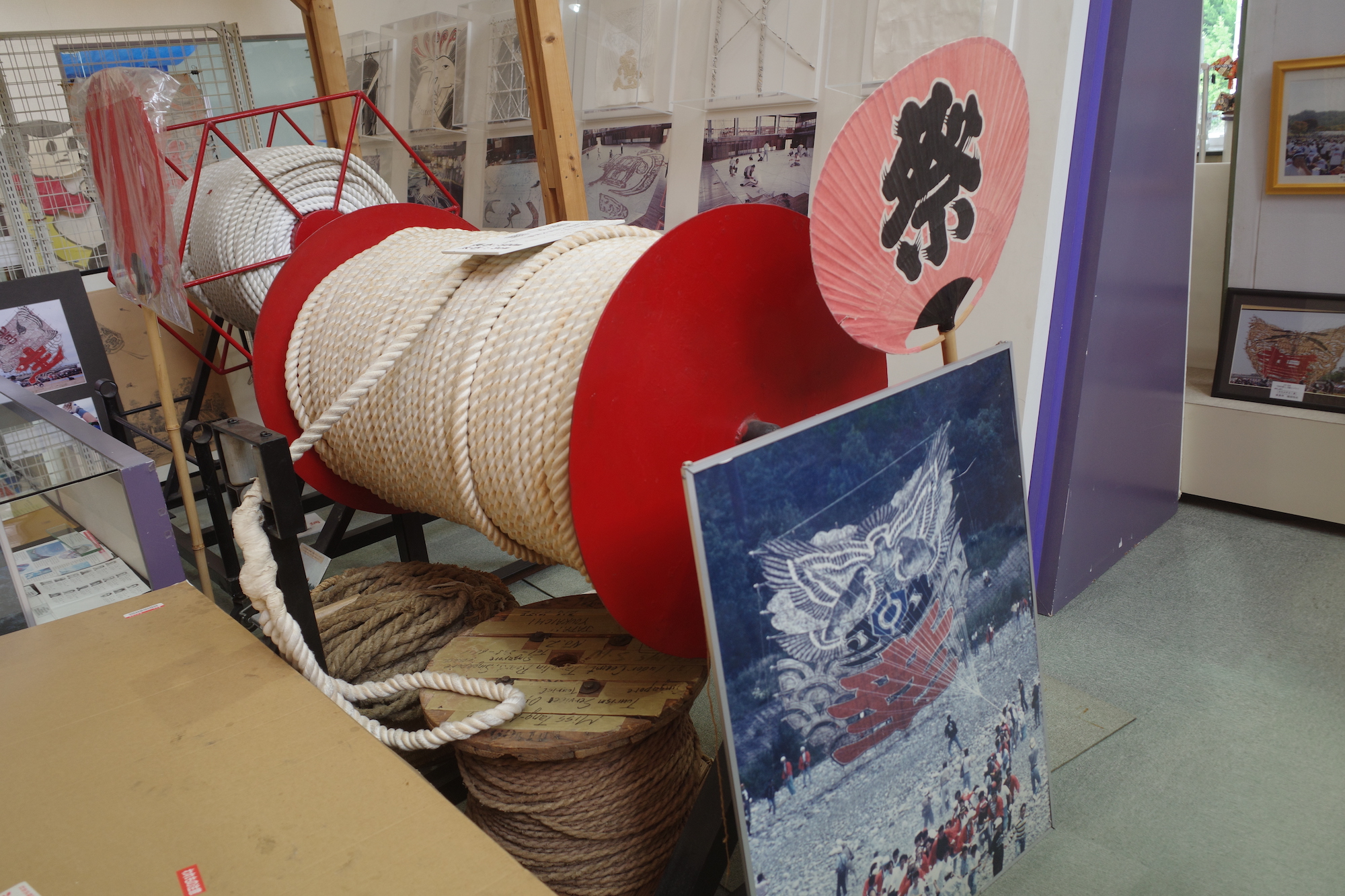以下の写真を見ていただくと、凧の大きさをより一層感じていただけるだろう。普通、凧といえば凧糸を使って飛ばすが、大凧はこのような「揚げ綱」という綱を使って飛ばさねばならない。こちらは昭和29年(1984年)に220畳の大凧を揚げるのに使った綱である。太さ(直径)3cm、長さ500mとのこと。