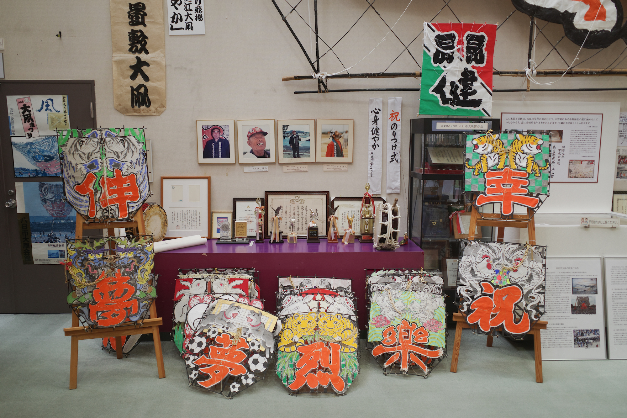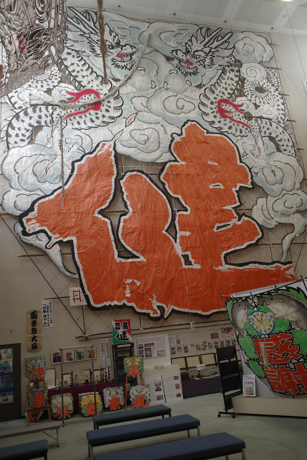 展示されている100畳の大凧「心身 健やか」は、例年5月の最終日曜日に行われている東近江大凧まつり(2011年までの名称は八日市大凧まつり)で実際に大空に舞い上がった。揚げ綱のついた大凧を、100人以上もの引き手が心を一つにして走りながら引き、ゆっくりと飛揚する様子は圧巻である。動画でぜひご覧いただきたい。